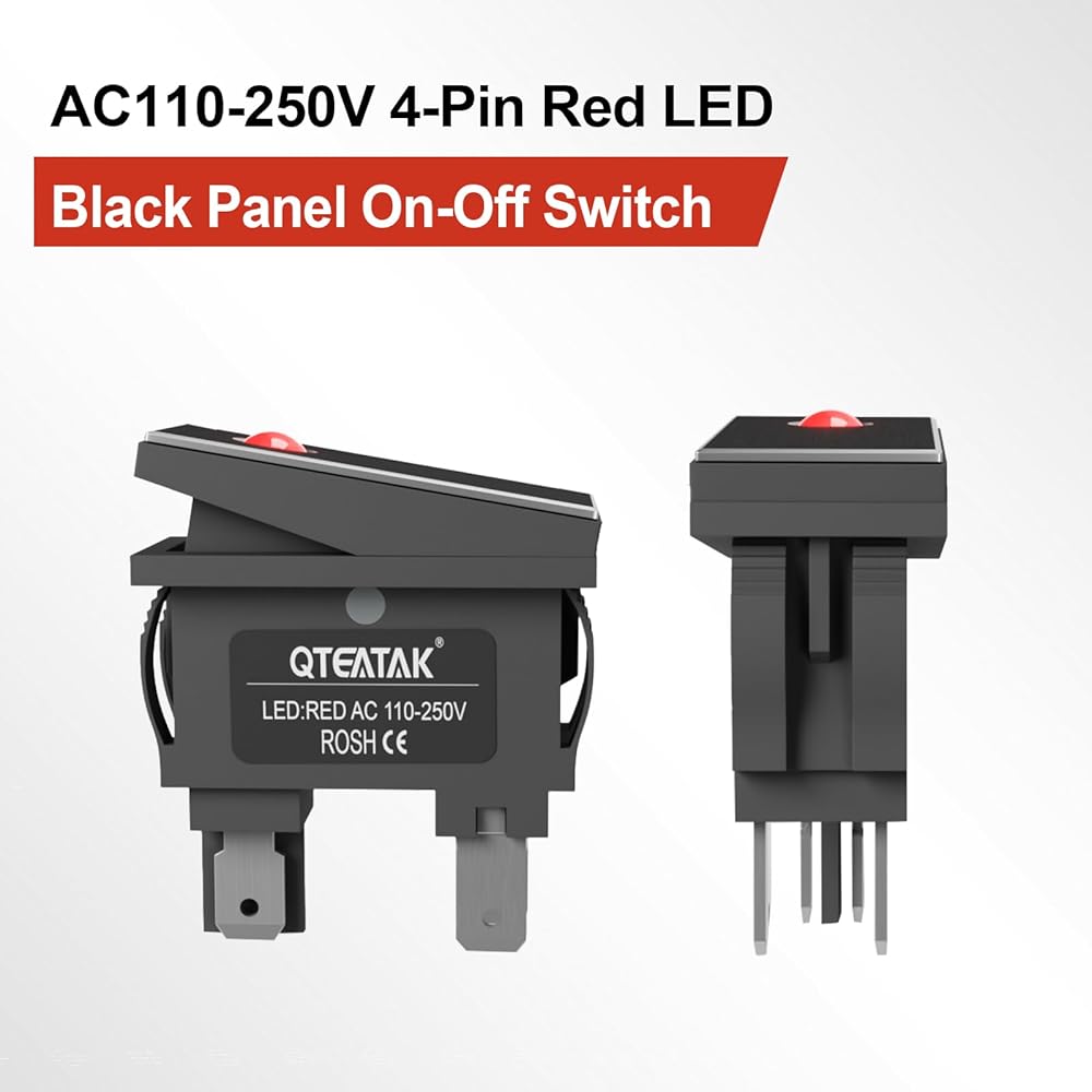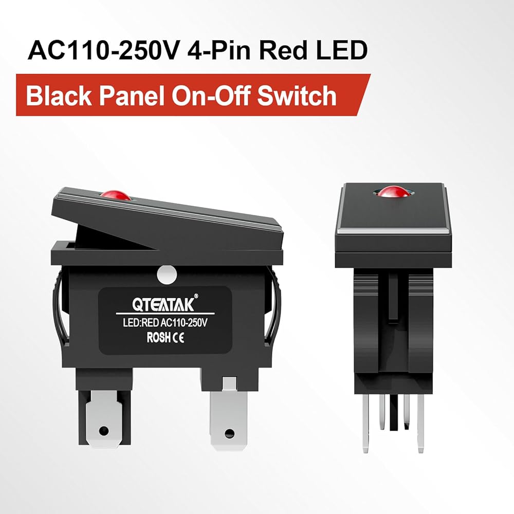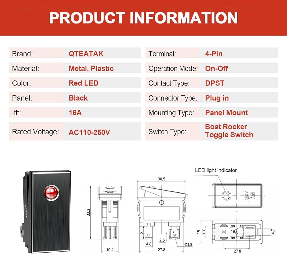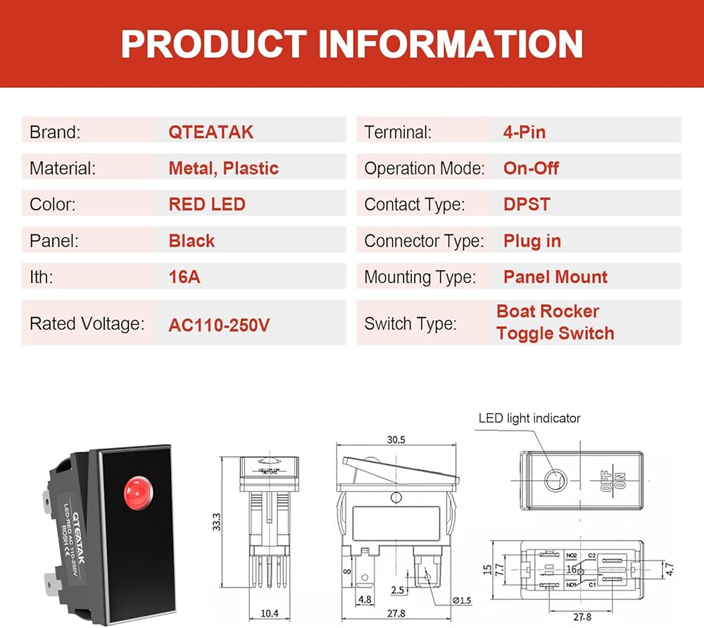 Product Parameters: Brand: QTEATAK Material: Metal, Plastic Color: Green LED Panel: Black Ith: 16A Rated Voltage: AC250V Terminal: 4-Pin Operation Mode: On-Off Contact Type: DPST Connector Type: Plug in Mounting Type: Panel Mount Switch Type: Boat Rocker Toggle Switch