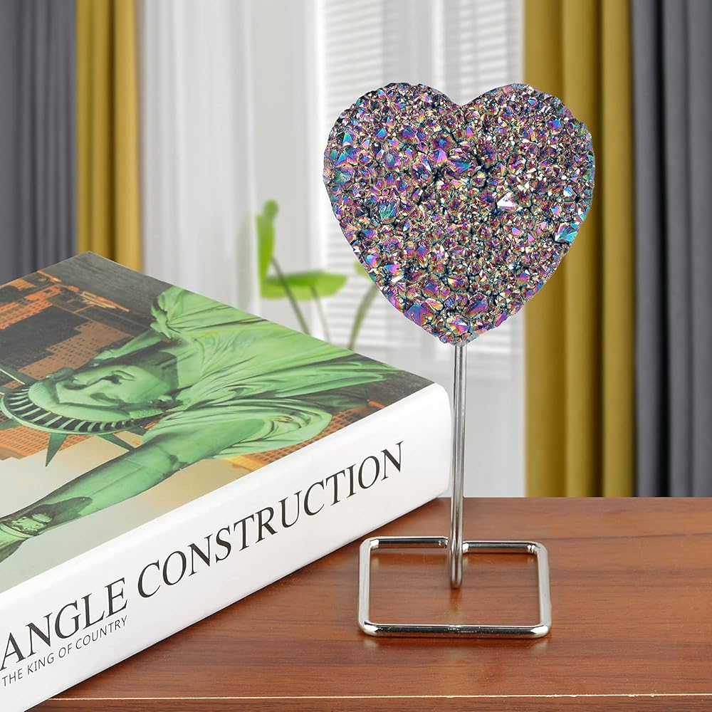حجر مطلي بالتيتانيوم على حامل عقلي: الكريستال الصخري عالي الجودة مقطوع يدويًا على شكل قلب رومانسي بألوان زاهية. يتمتع الحامل المعدني المطلي باللون الأسود في الأسفل بدعم قوي ومتين للغاية. تعتبر زخرفة سطح المكتب التي تتناسب بهذه الطريقة جميلة وعملية.