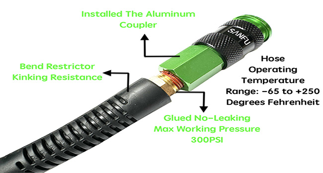 ➤المرونة والمتانة - يمكن لخرطوم الهواء المقوى بالبولي يوريثان أن يصل إلى أقصى ضغط عمل 300 رطل لكل بوصة مربعة، أقصى ضغط للانفجار هو 1200 رطل لكل بوصة مربعة. نطاق درجة الحرارة هو -65 إلى +250 درجة فهرنهايت. خرطوم محمول وسهل الحمل في يدك، فهو خفيف الوزن للغاية مقارنة بخرطوم الهواء المطاطي.