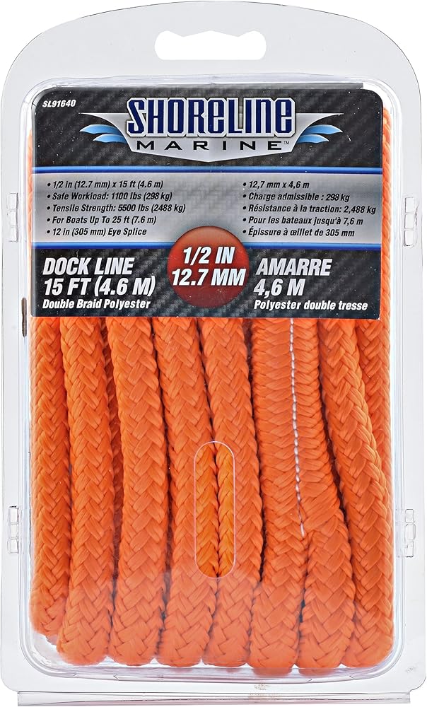 The Shoreline Marine Double Braided Polyester Dock line features a 12-Inch eye splice on one end and is ready-to-use to secure your boat to the dock or another vessel. Made of high strength polyester. The Shoreline Marine Dock line utilizes a braided design instead of multi-strand twisted design, which is much more pleasant on your hands. The Shoreline Marine dock lines are available in three highly visible neon colors.
