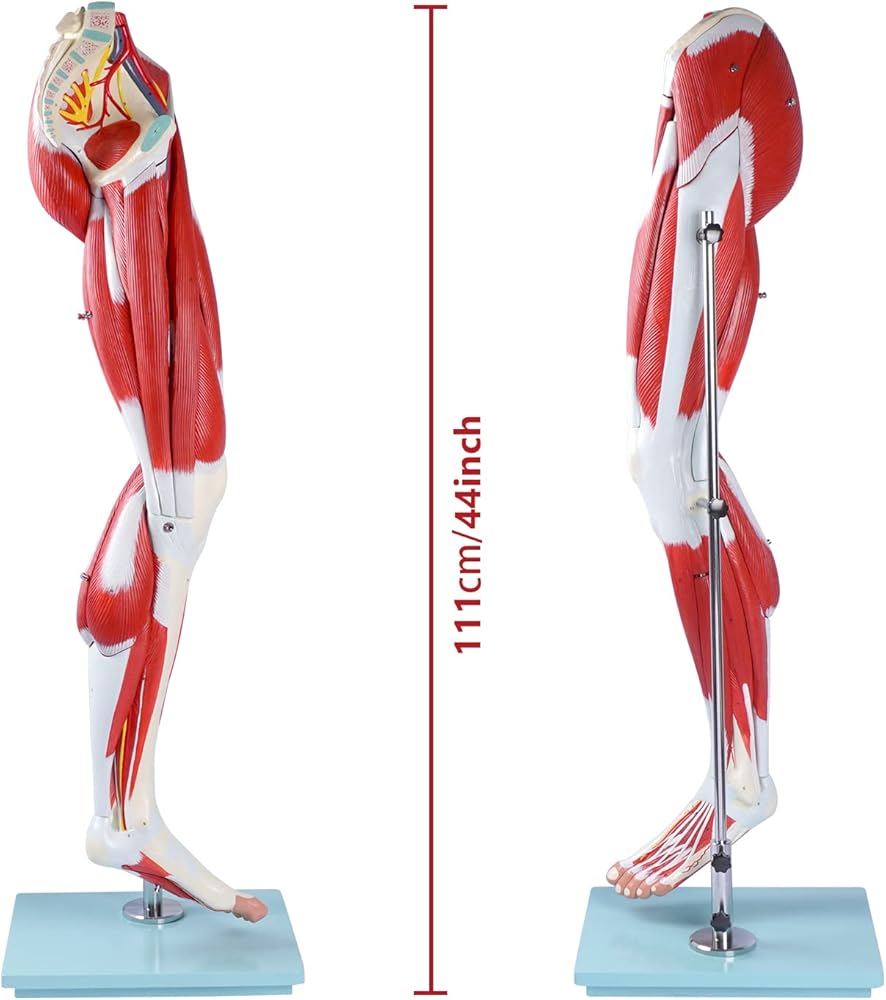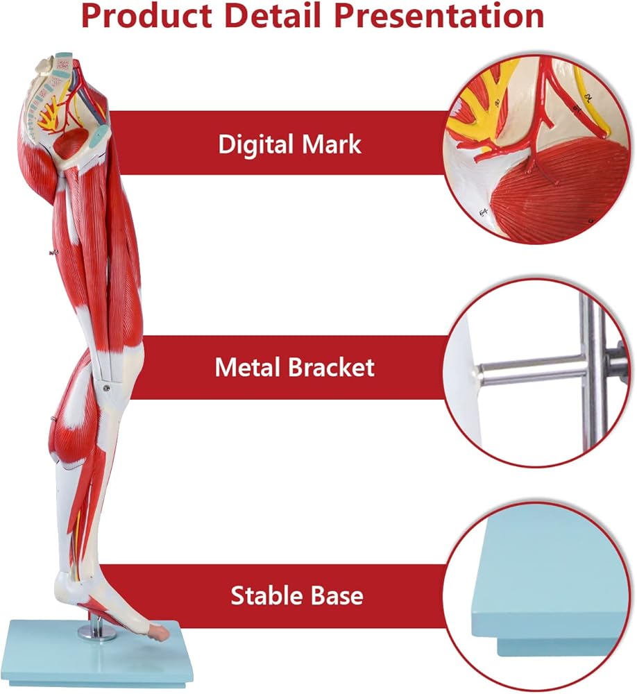 النموذج المرقم: هياكل العضلات الرئيسية هي الورك والفخذ والساق والقدم. تم تصنيف كل هيكل بوضوح ويتوافق مع المفتاح التفصيلي المصاحب. تم تصنيف كل سمة من سمات الساق بوضوح، مما يسمح بإجراء دراسة شاملة لكل عضلة، بالإضافة إلى شرايين وأعصاب الساق.