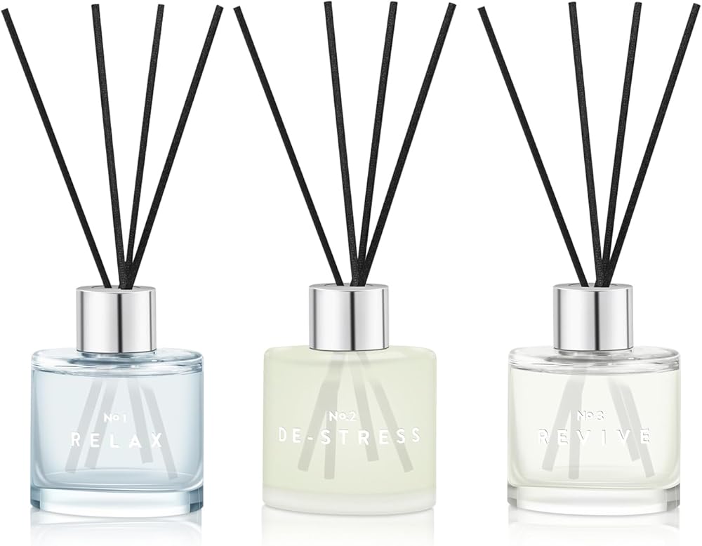 [ديكور مذهل]: 3 مجموعات من أجهزة توزيع روائح القصب توضع على سطح المكتب أو طاولة الزينة، وتطلق رائحة دافئة ومبهجة في الهواء.