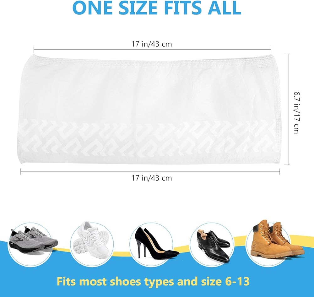 مقاس أكبر: مقاس قابل للتمدد حوالي 16.9 بوصة طول، 6.7 بوصة (عرض)، تحتوي أغطية الأحذية على شريط مطاطي للمرونة، مناسبة لمقاس الحذاء 6-14 (حتى أحذية العمل الرجالية الأمريكية 12).