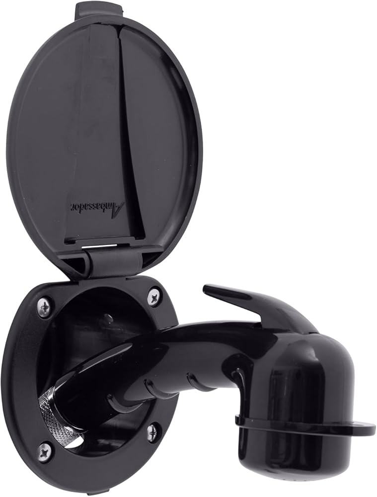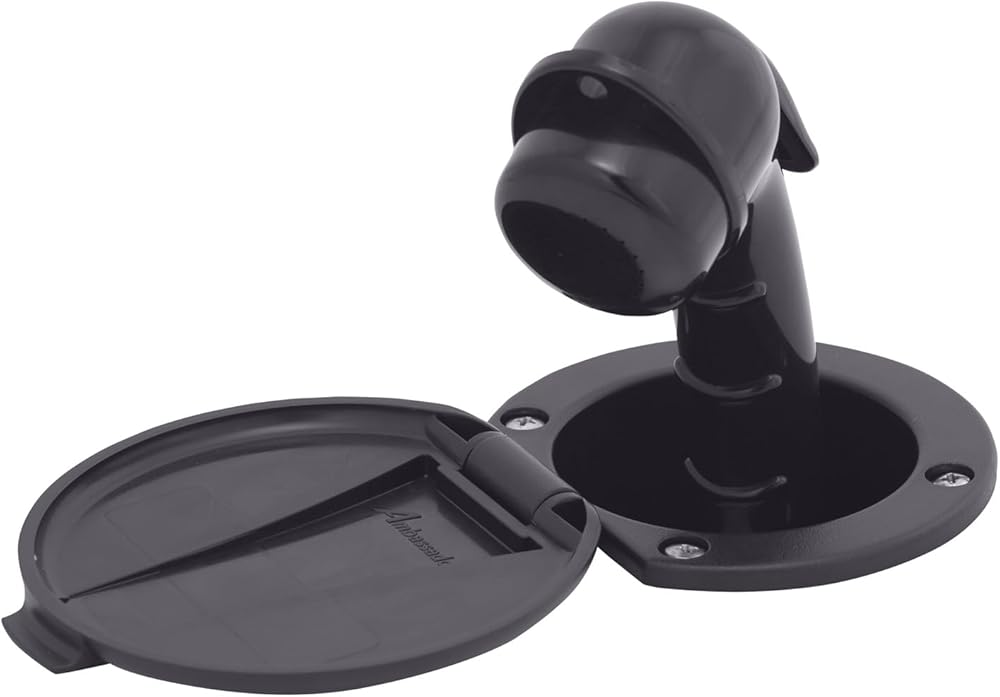 The Ambassador Marine recessed shower blends clean lines with our marine styling to provide a clean look for your boat, R.V., van or anywhere else you want a recessed sprayer or shower. These units are available in Arctic White, Warm White, Black and Chrome. The shower hose is available in 6-foot or 10-foot white or black rubber and stainless hose. The small marine grade ABS sprayer is UV protected and has an integrated eye to easily hang for a shower. Note: “No Eyelet” sprayers cannot be hung and must be hand held. Depressing the trigger allows for intermittent water flow while lifting trigger locks it on for continuous water flow. Complete water shut-off occurs when the trigger is not engaged