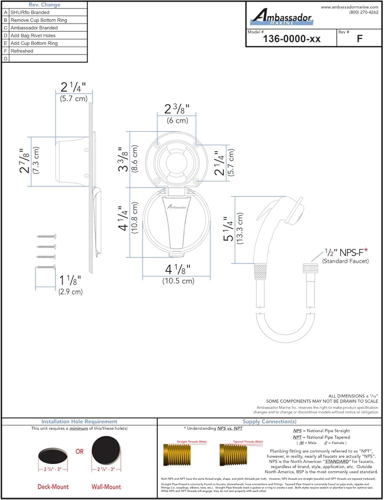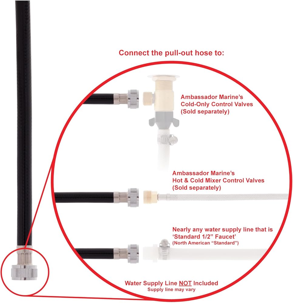 • Ambassador Marine Shut-Off Valves or Recessed Shut-Off Valves, but will work with any 1/2" NPT-M or NPS-M water supply.