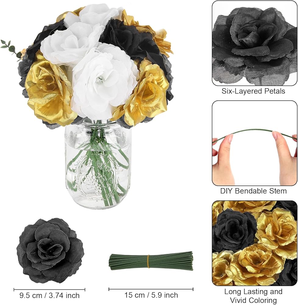 108 قطعة من رؤوس الورد و108 قطعة من السيقان - تتضمن حزمة الزهور الاصطناعية هذه تشكيلة واسعة من 108 رؤوس ورود حريرية نابضة بالحياة و108 قطعة من السيقان المعدنية. يبلغ طول السيقان المعدنية 15.24 سم، ويمكن ثنيها أو تشذيبها بسهولة لتناسب الترتيب المرغوب فيه.