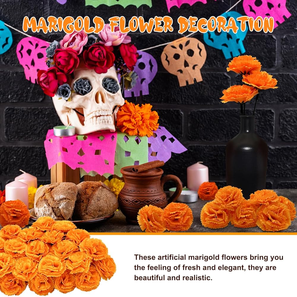 50 قطعة من رؤوس زهور القطيفة مع سيقان، زهور صناعية من القطيفة الحريرية لـ Dia De Los Muertos، مجموعة زهور سيمباسوشيل البرتقالية ليوم المذبح الميت Ofrenda، ديوالي، الحفلات، الهالوين، ديكور المنزل