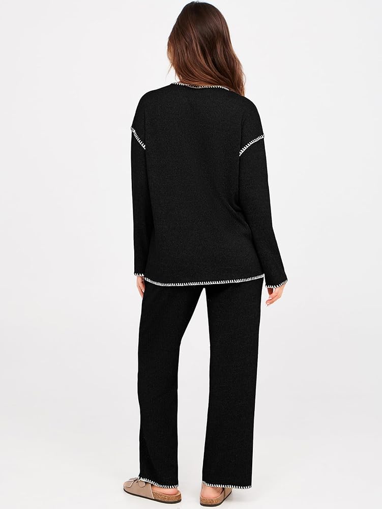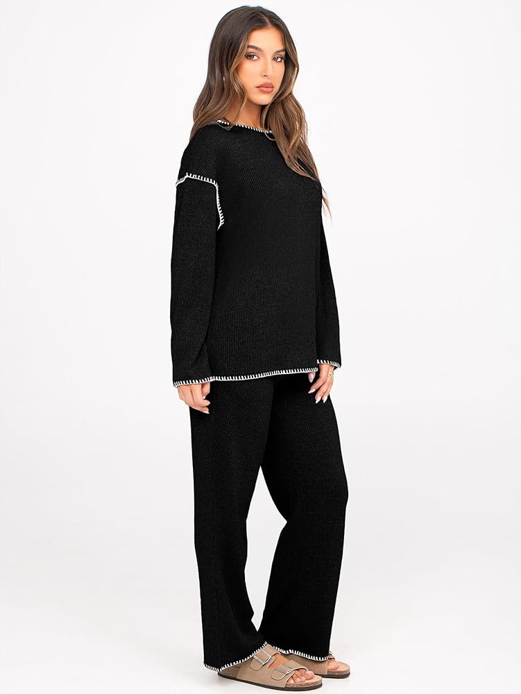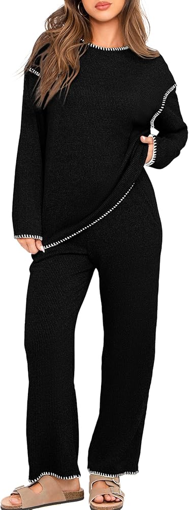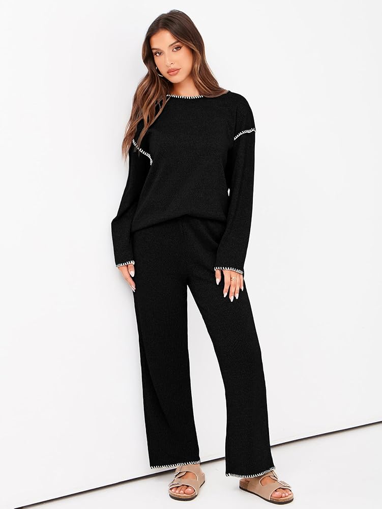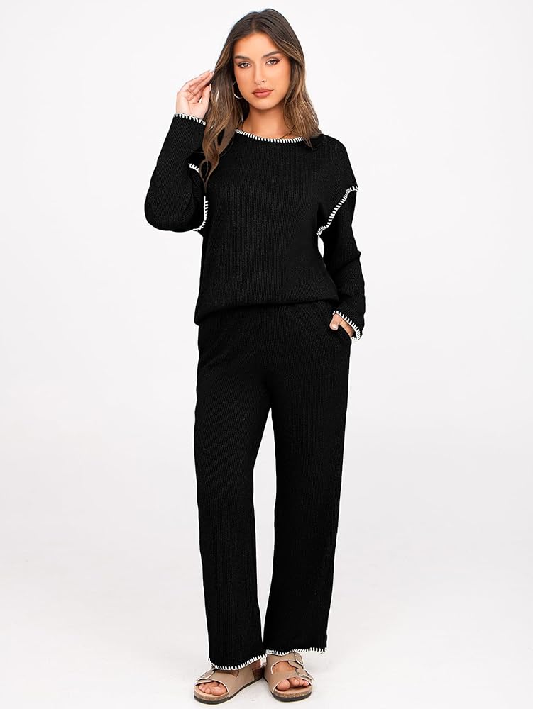【المميزات】: طقم صالة من قطعتين للنساء/ملابس نسائية ذات ألوان متباينة/بنطلون عالي الخصر وواسع الساق/مجموعة سترة محبوكة/مجموعة ملابس استرخاء نسائية/مجموعات متطابقة ملابس نسائية/بلوفر برقبة دائرية/ملابس خريف وشتاء للنساء/ملابس سفر للإجازات للنساء /زي المطار مريح مع جيب/أطقم بيجاما للنساء/تصميم مطرز