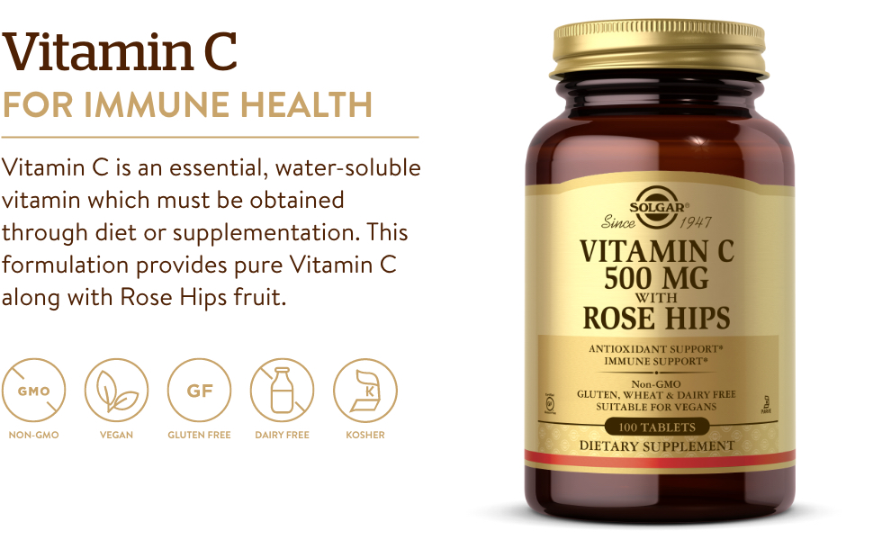 غير معدّل وراثيًا وخالي من الغلوتين؛ Solgar Vitamin C 500 mg مع أقراص Rose Hips مناسب للنباتيين؛ خالي من: الغلوتين والقمح ومنتجات الألبان والخميرة والسكر والصوديوم والنكهات الاصطناعية والمحليات