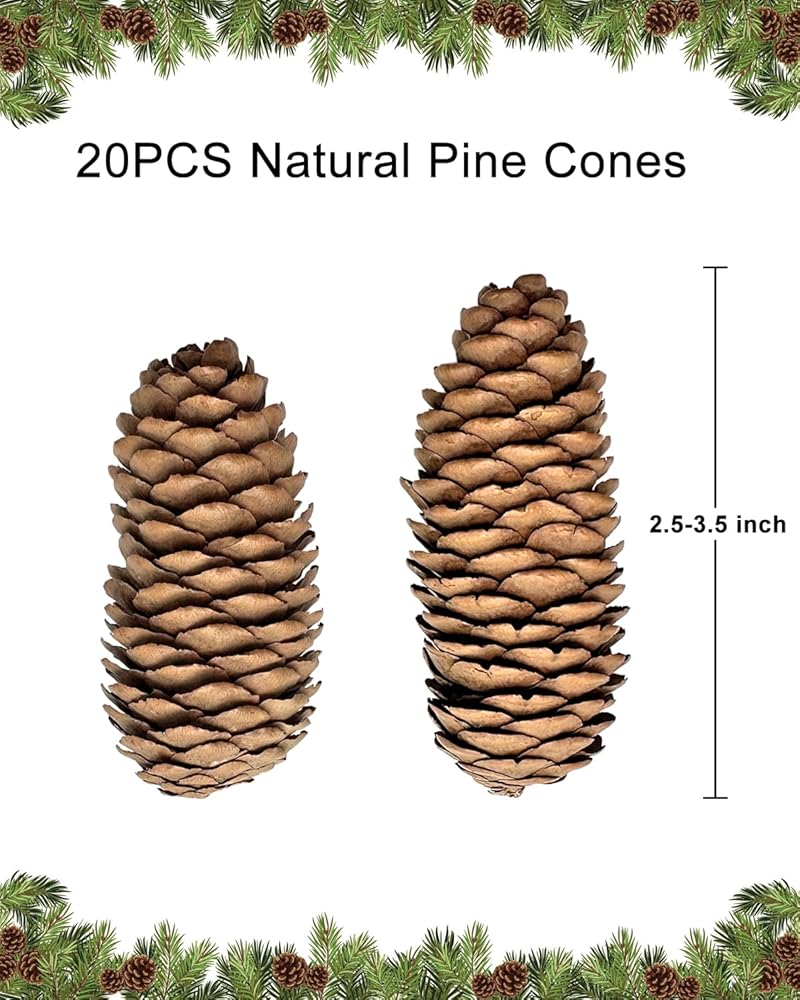 تشمل العبوة: سوف تحصل على 20 قطعة من مخاريط الصنوبر الكبيرة بمقاس 4.3-5.9 بوصة. كافية للحفلات العائلية وديكور العطلات وشجرة الكريسماس، وتضيف لمسة طبيعية وتخلق جوًا دافئًا ومريحًا لديكورات الكريسماس.
