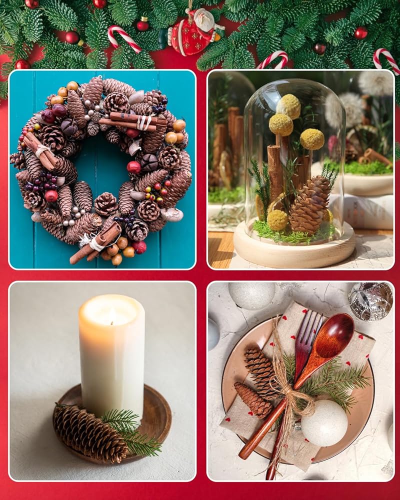 الاستخدامات: تضيف زخارف مخاريط الصنوبر ملمسًا احتفاليًا وريفيًا إلى ديكور عيد الميلاد، مما يجعلها مميزة ولا تُنسى. مخاريط الصنوبر للحرف اليدوية متعددة الاستخدامات للمزهرية وحشو الوعاء، وشجرة الكريسماس، والأكاليل، والأكاليل، والطاولة، والجدار، والنافذة، والباب، والمشروعات اليدوية، المطلية أو المصبوغة، وصناعة الزينة للعطلات، والورق المجفف.