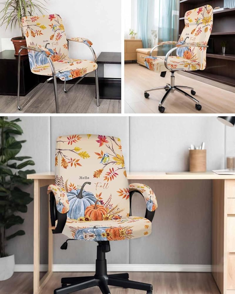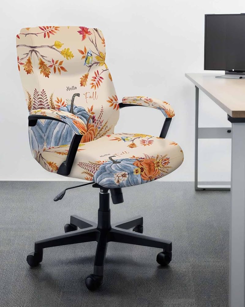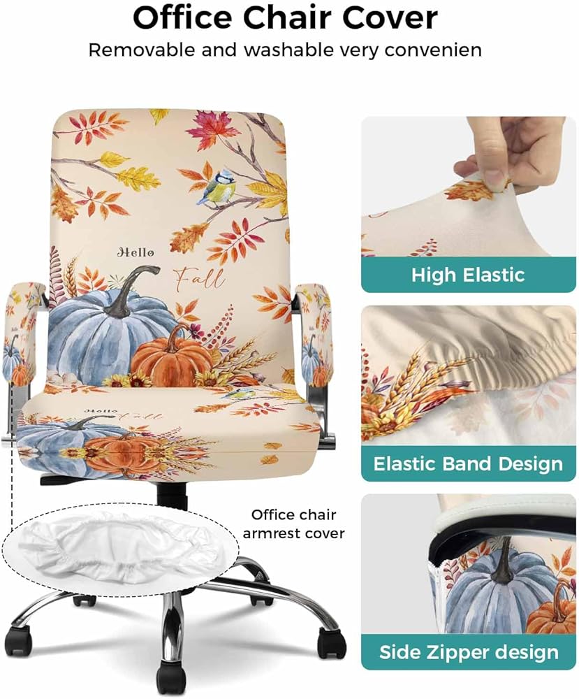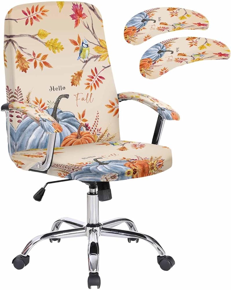 مرحبا الخريف غطاء كرسي مكتب كبير لمط مع أغطية مسند الذراع، عيد الشكر اليقطين يترك الطيور الأزرق البرتقالي القابل للإزالة كرسي الكمبيوتر الخلفي يغطي مكتب مكتب كرسي مقعد وسادة الأغلفة