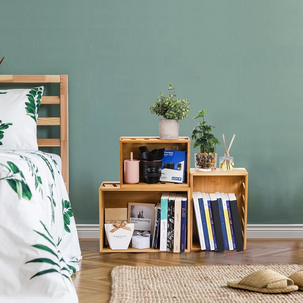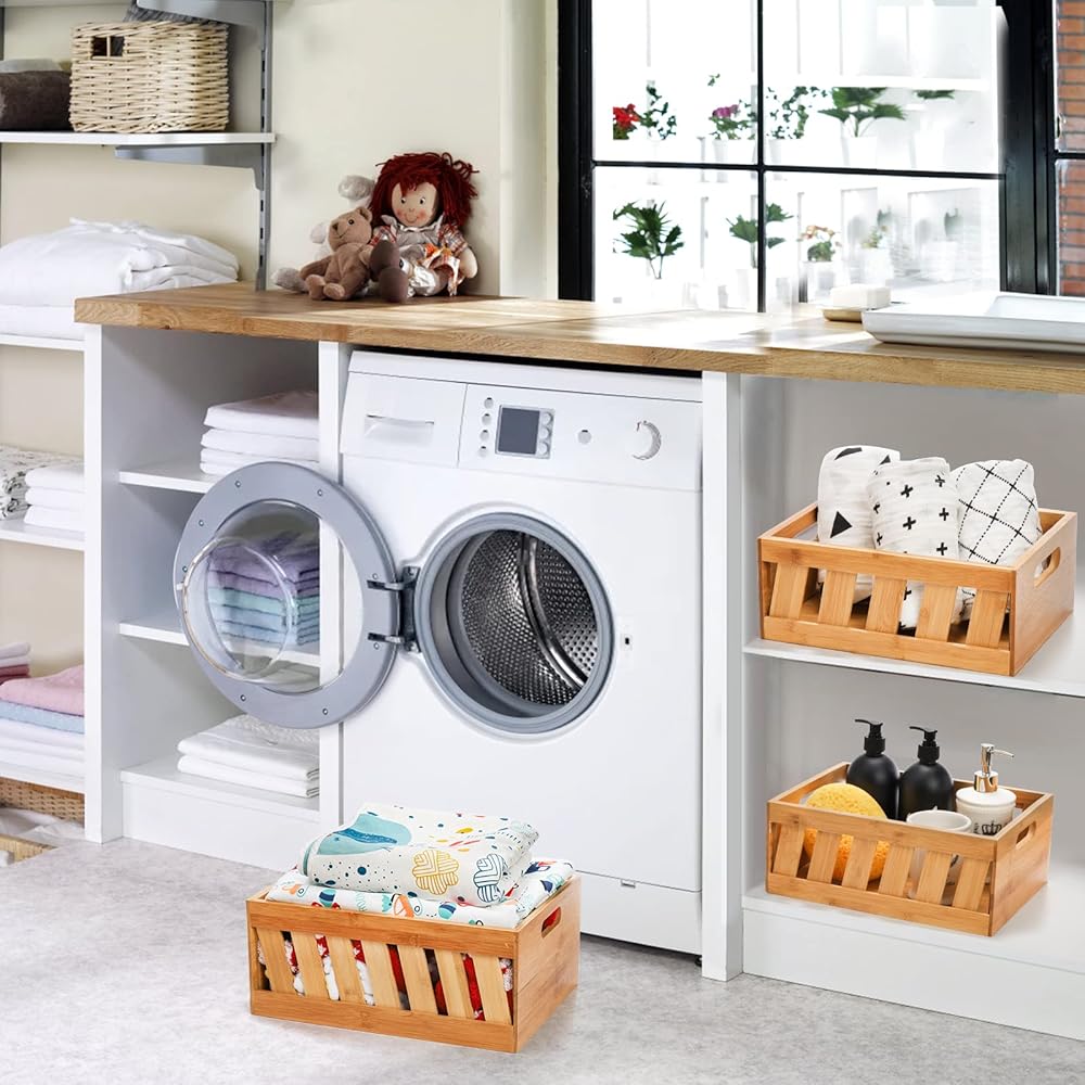 صناديق التخزين الخشبية مصنوعة من الخيزران الطبيعي، قوية ومتينة وتدوم طويلاً. المقابض المقطوعة تجعل من السهل تحريكها.