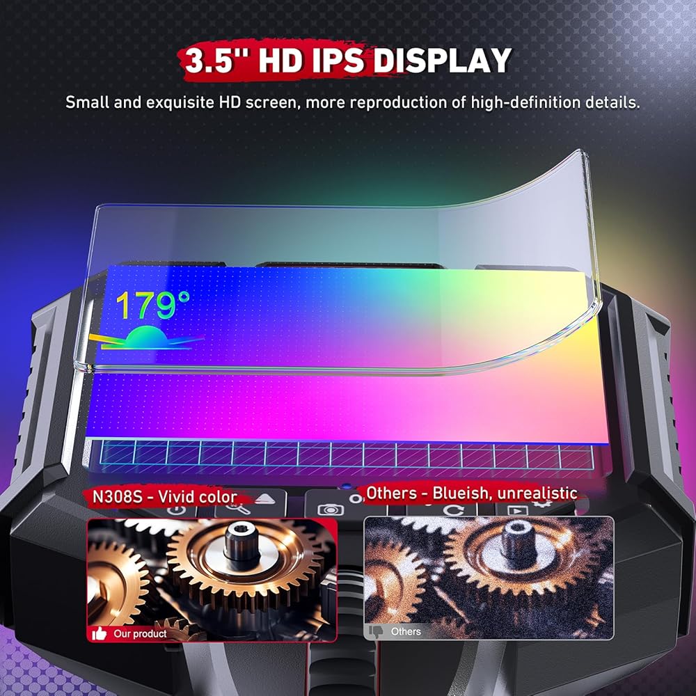 【شاشة عرض كاملة عالية الدقة 179 درجة مع تكبير 4x】يتميز بوريسكوب 3.5 بوصة بشاشة عرض كاملة عالية الدقة 179 درجة مع شريحة CMOS 1/9 وقدرة تكبير 4x، مما يوفر عرض صورة واضح ونابض بالحياة. يمكن أن تدور الشاشة بمقدار 180 درجة، مما يسمح بإجراء عمليات الفحص من زوايا مختلفة وتعزيز المرونة