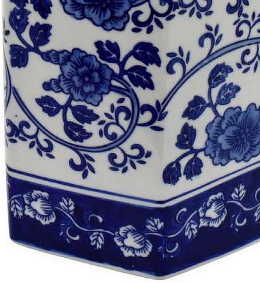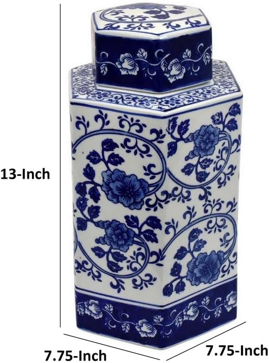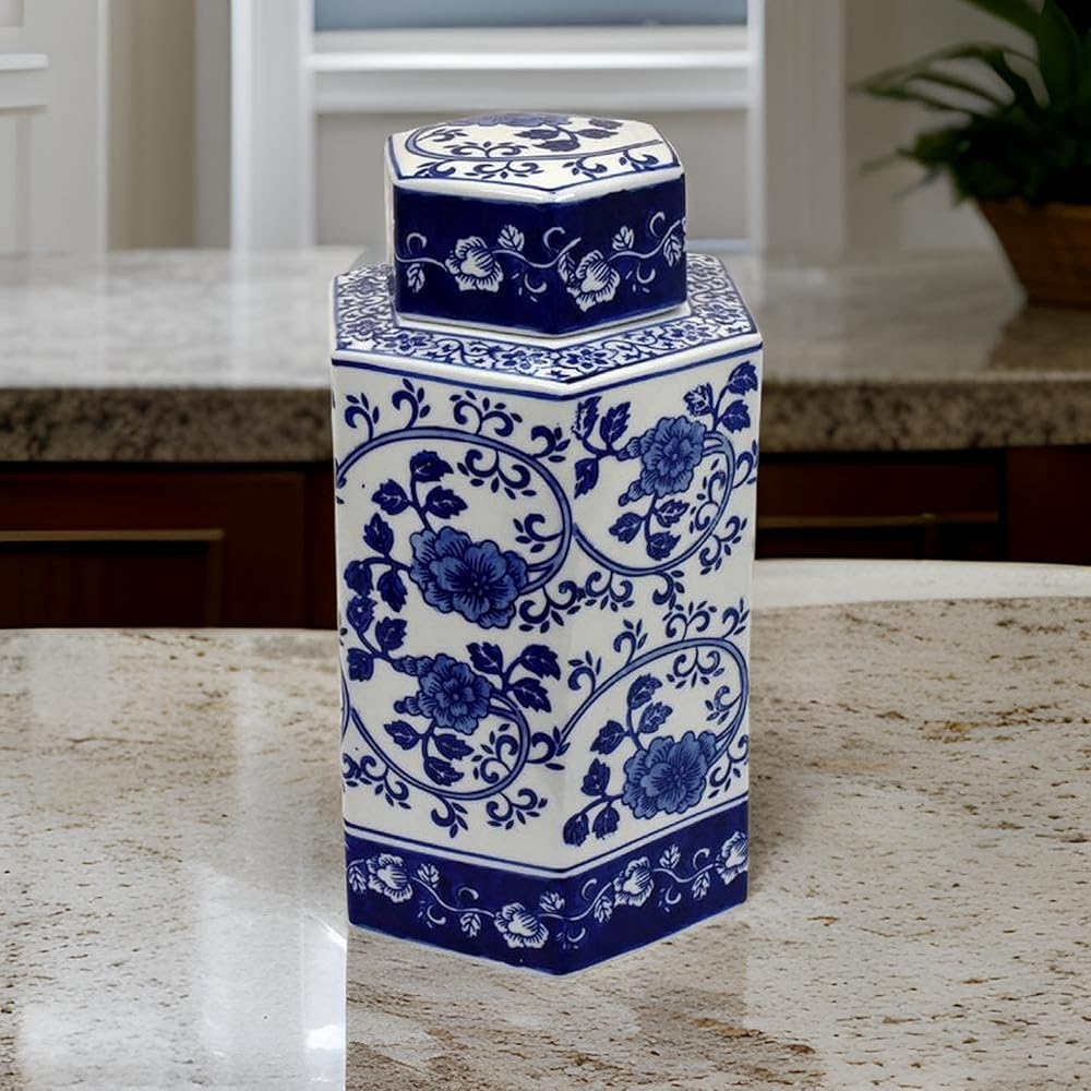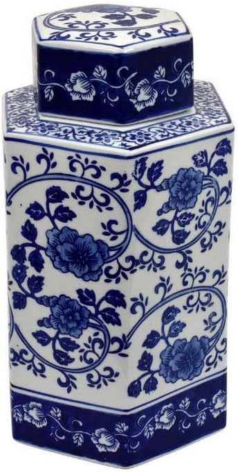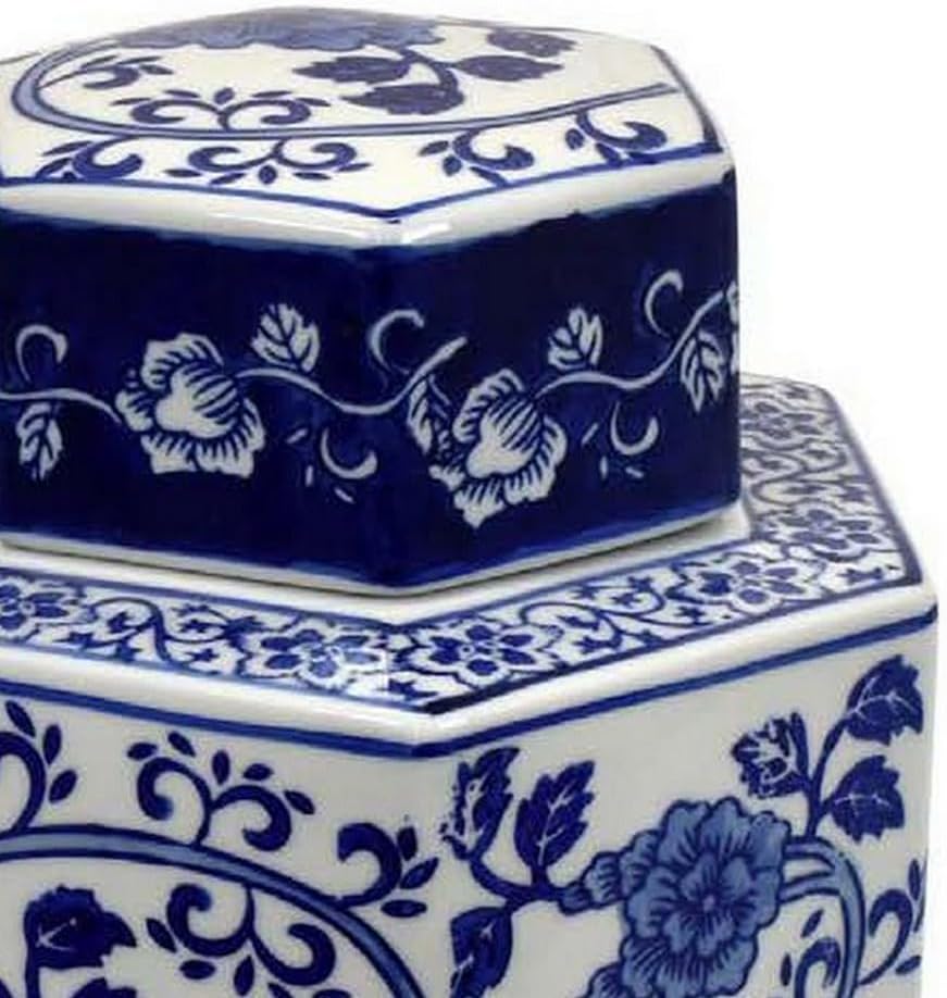 Bring class and regality to the theme of your kitchen, foyer, or dining room decor with this ceramic ginger jar. With its unique chinoiserie art over a hexagonal shaped body, the intricate art along the edges, lid, and body of this piece harmonize elegantly with any accessories inside of your beloved abode. It can be paired beautifully with other vintage or antique style interior accents.