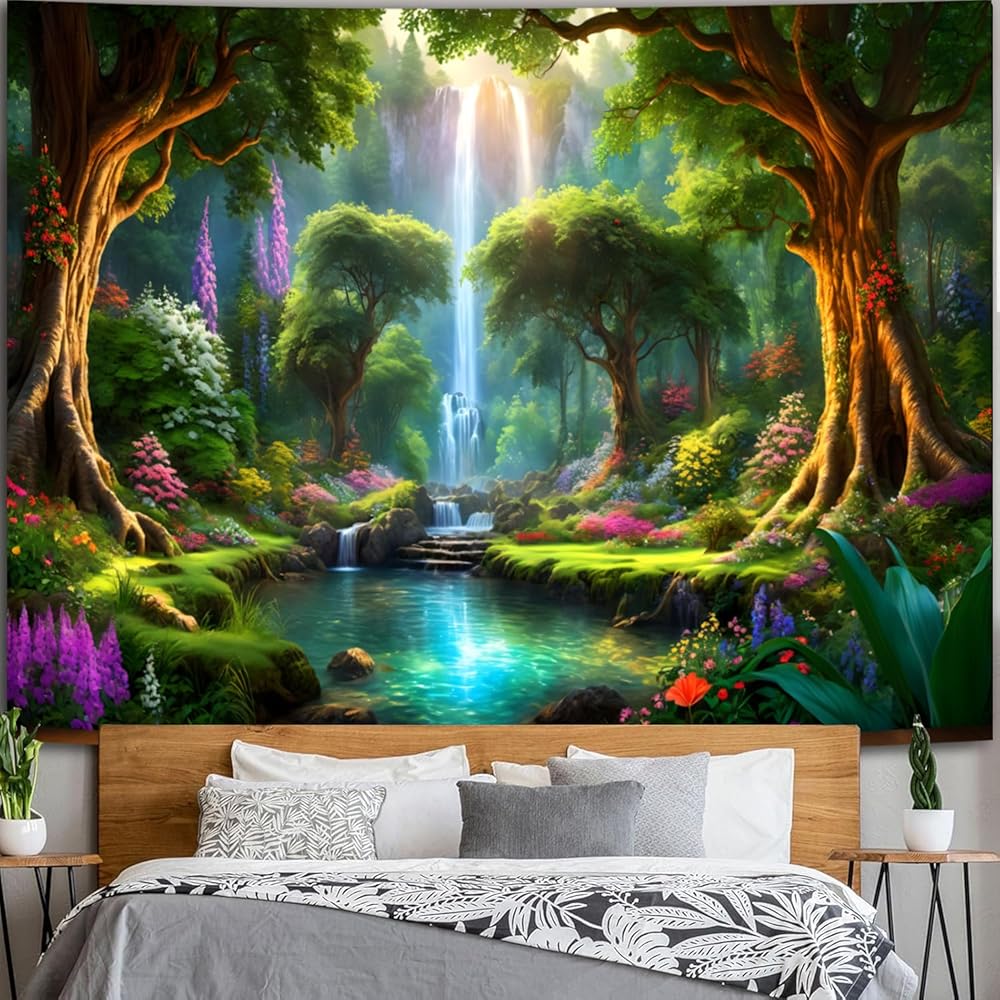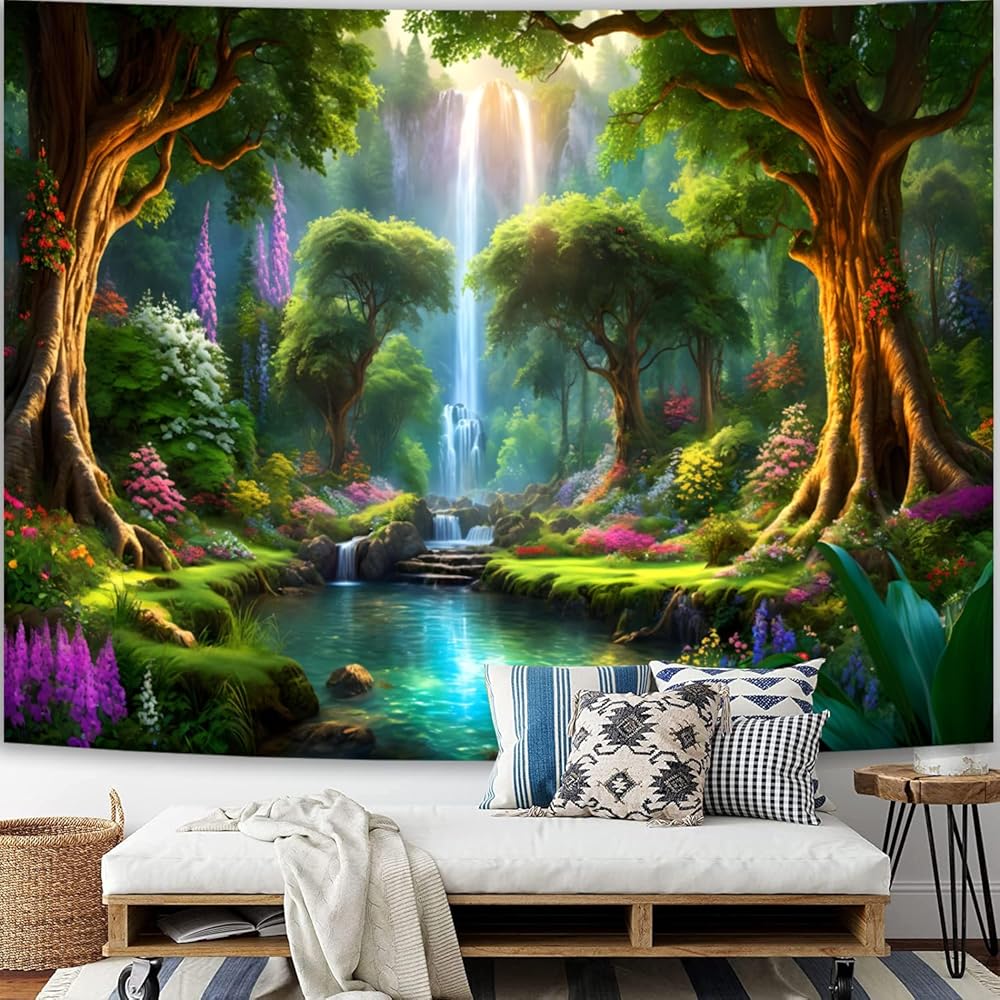 Bring the peaceful vibes of nature into your home with the Forest Tapestry. Whether you want to create a relaxing bedroom sanctuary or add a touch of nature to your living room, this tapestry is the perfect choice. The vibrant green trees, sparkling waterfall, and sunshine-dappled river create a stunning visual escape that instantly transforms any space.