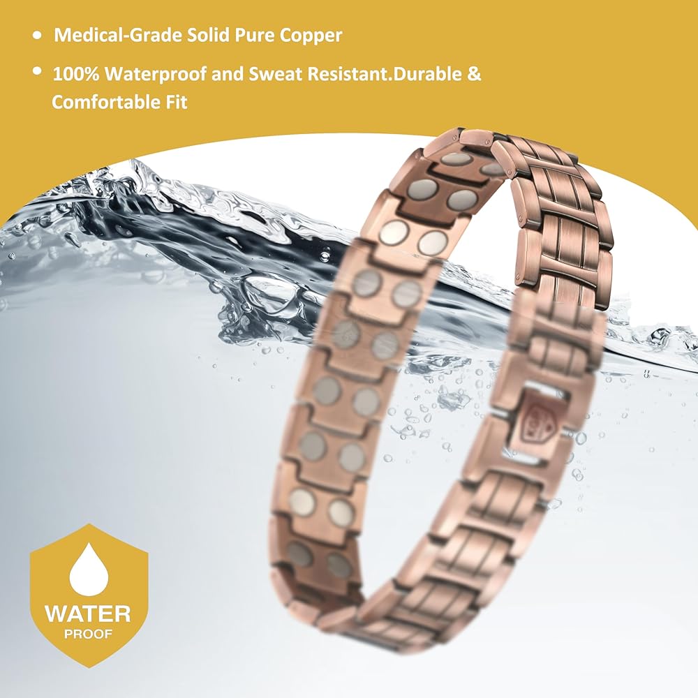 نحاس فاخر - مصنوع بدقة من النحاس النقي بنسبة 99.99%. تتميز الأساور المغناطيسية النحاسية النقية ذات المغناطيس القوي بلمسة نهائية مصقولة وطلاء واقي لتعزيز المتانة. تتطلب المجوهرات النحاسية رعاية مناسبة للحفاظ على درجة اللون الأصلية. يجب على المستخدمين الحفاظ على الأساور المغناطيسية النحاسية جافة لمنع الصدأ/تغير اللون.