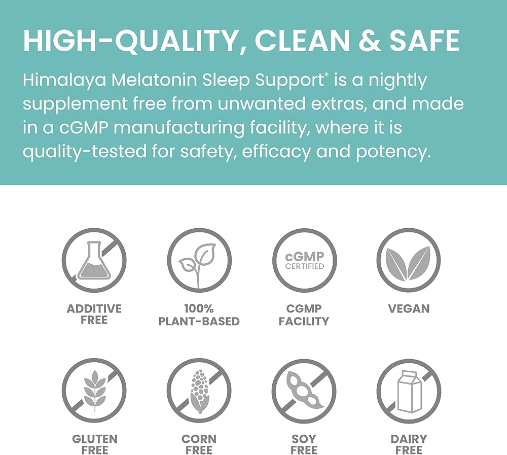 نظيفة وآمنة: كبسولات هيمالايا ميلاتونين لدعم النوم خالية من الإضافات الاصطناعية والحشوات الاصطناعية والمجلدات والسواغات. كما أنها خالية من الغلوتين والقمح والذرة والصويا ومنتجات الألبان في مكمل نباتي للنوم.