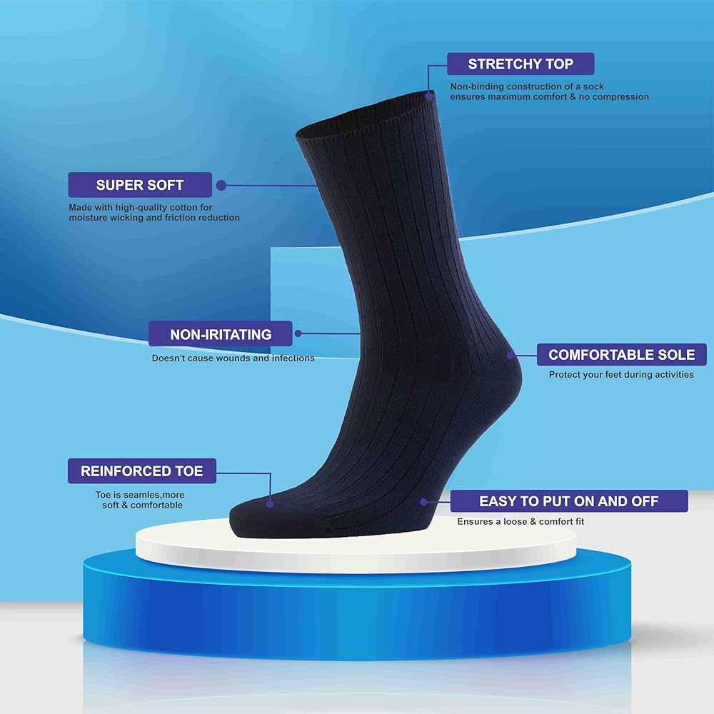 خفيفة الوزن: جوارب دائرية للرجال والنساء ذات اللون الصلب لمرضى السكري. خفيف الوزن وغير مربوط، رائع للدورة الدموية. المقاس الفضفاض لن يقيد ساقيك وينزلق بسهولة على الكاحلين والقدمين المتورمتين. أفضل زوج من الجوارب على الإطلاق للأشخاص الذين يعانون من الوذمة والسكري والاعتلال العصبي.