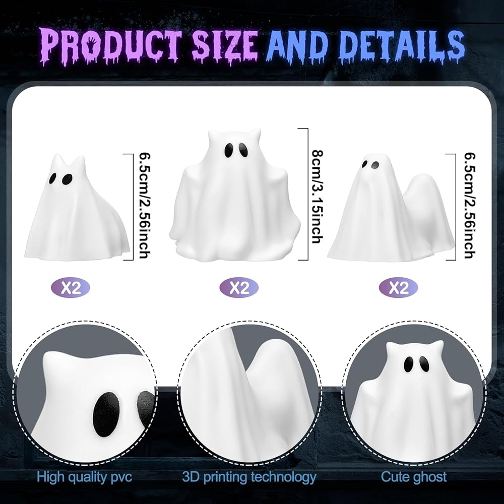 Ideally Proportional Size: with a height ranging from 1.97-3.15 inches and a width of 1.57-3.54 inches, these ghost figures are designed with a suitable size to fit into varied decorations arrangements; Whether nestled in a bookshelf, or even as a centerpiece on a table, they effortlessly add a bewitching vibe to your space