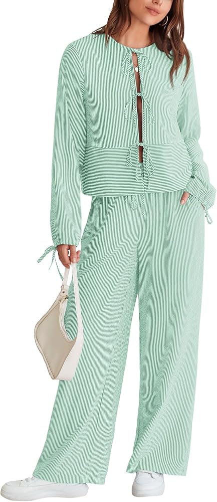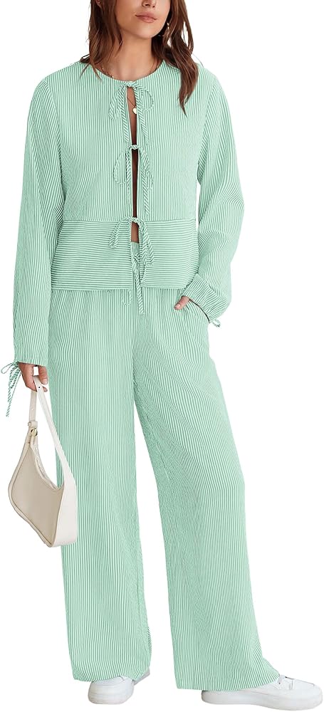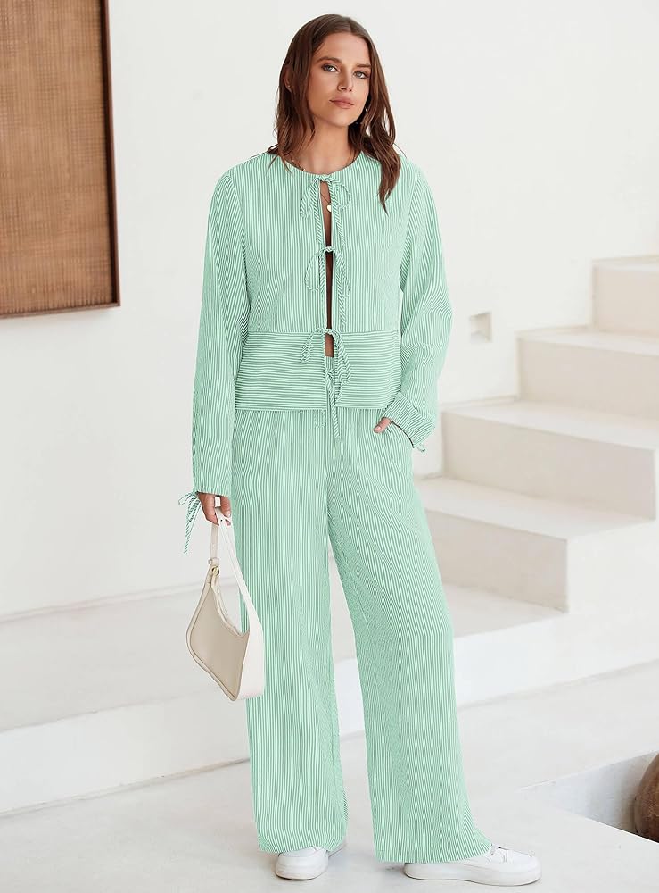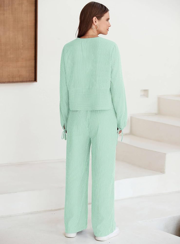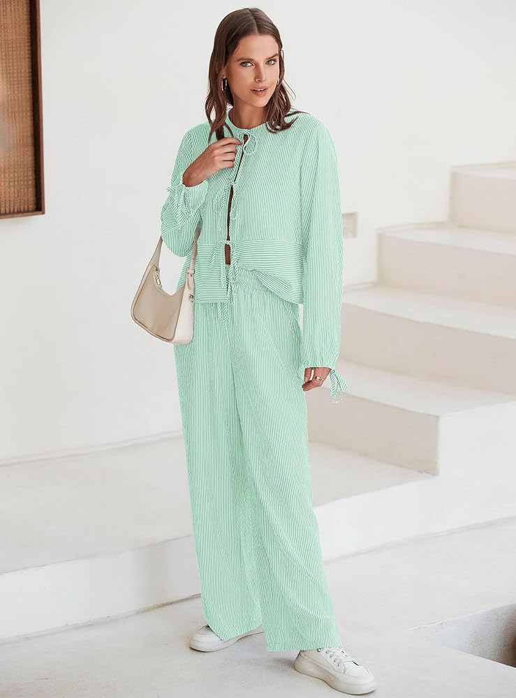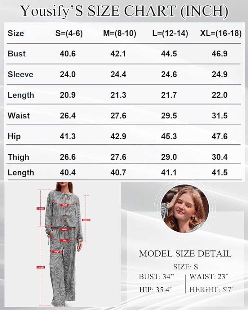 البنطلون: الساق الواسعة ذات التصميم المخطط تطيل ساقيك وتكمل أنواع الجسم المختلفة؛ يوفر الخصر المرن مع تصميم الرباط العملي مقاسًا قابلاً للتعديل يضمن الراحة طوال اليوم