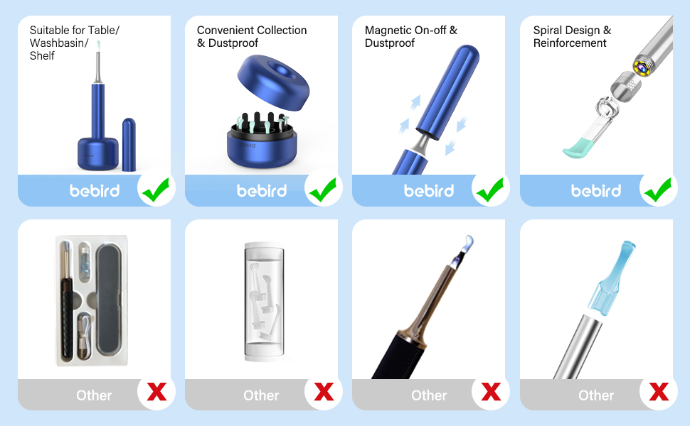 【مجموعة آمنة لإزالة شمع الأذن】- مجموعة أدوات تنظيف الأذن من Bebird معتمدة من UL وFCC وRoHS وCE، كما أن نطاق الأذن Bebird أكثر أمانًا بعد الترقية، ويمكن أن تلبي مجارف الأذن المصنوعة من السيليكون المختلفة احتياجات معظم الأشخاص.