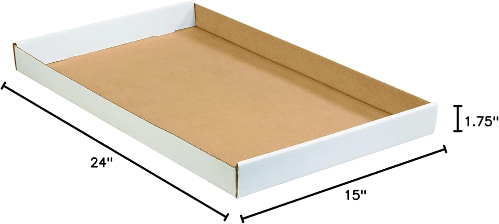 24" x 15" x 1 3/4" White Corrugated Trays. Perfect for transporting small, lightweight loads. Easy-to-fold sides provide additional stability and security when moving plants or carrying cans, bottles and other miscellaneous items. Made from 200#/ECT-32 white corrugated. Sold in bundle quantities. Trays ship and store flat.