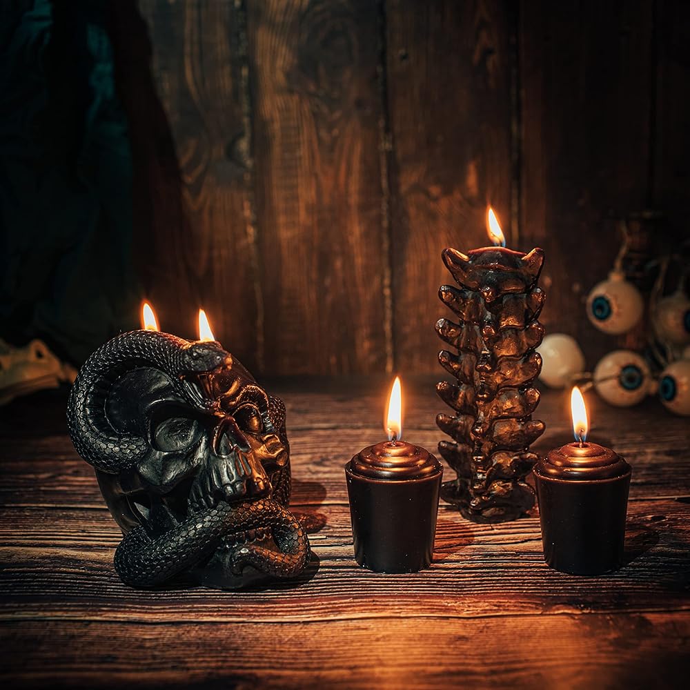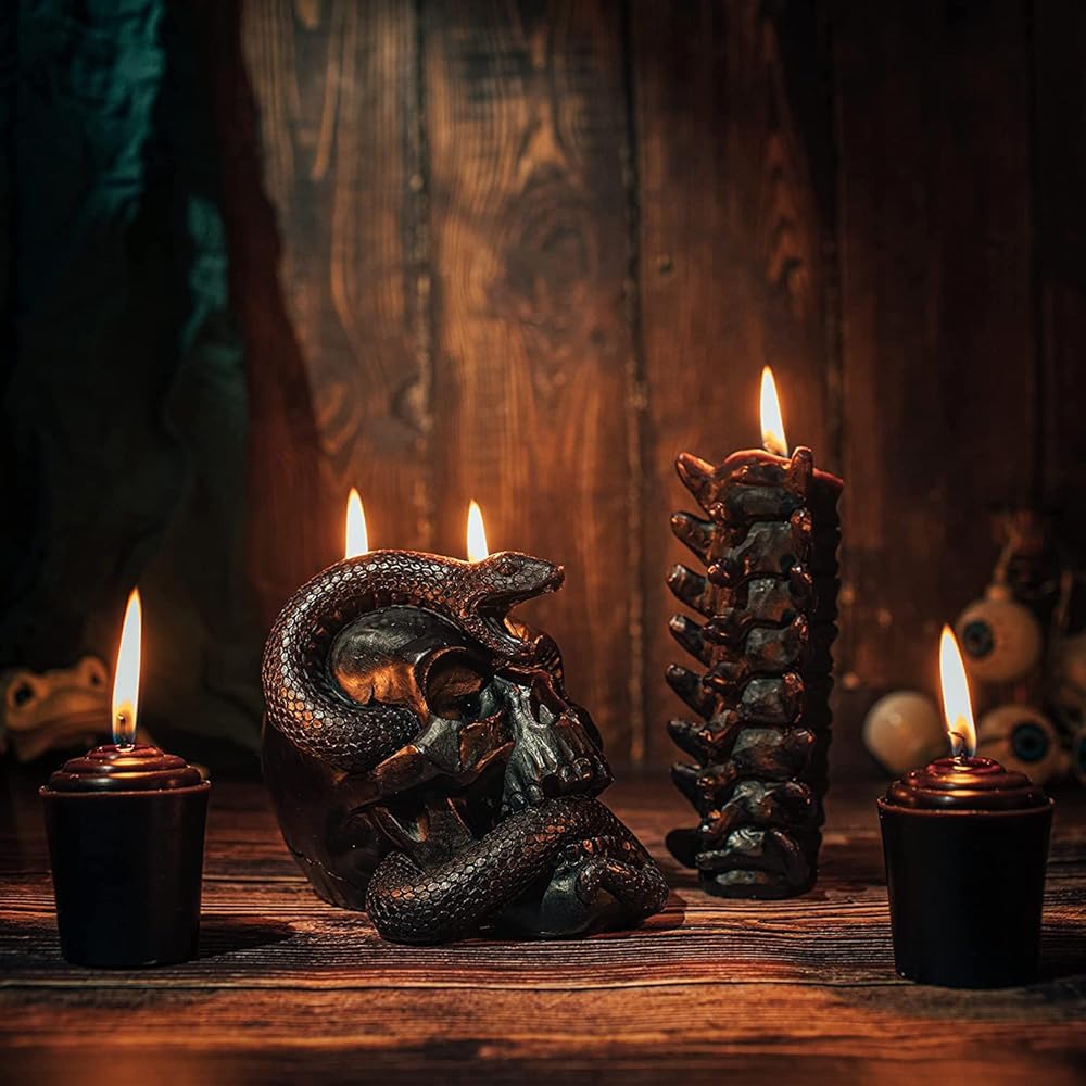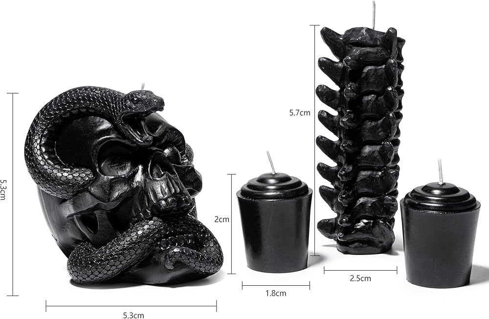 تُعد مجموعة شموع الجمجمة الهالوين المكونة من 4 قطع إضافة رائعة لديكور غرفتك. إنه مصنوع يدويًا بخبرة مع الاهتمام بالتفاصيل ومزين بهيكل عظمي غريب الأفعى والعمود الفقري والعظام السوداء. تعتبر الجمجمة مع ثعبان يتسلق من عينه مثالية لوضعها على مكتبك أو حافة النافذة أو الطاولة مما سيضيف إحساسًا مخيفًا إلى ديكور منزلك. إنه أحد أفضل الخيارات لإضفاء مزيد من الحياة والأناقة على ديكور الهالوين الخاص بك.