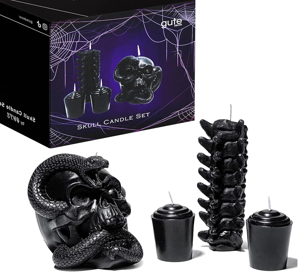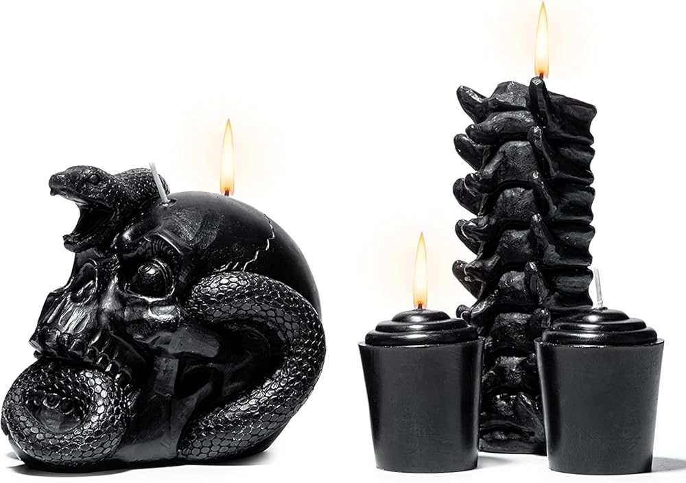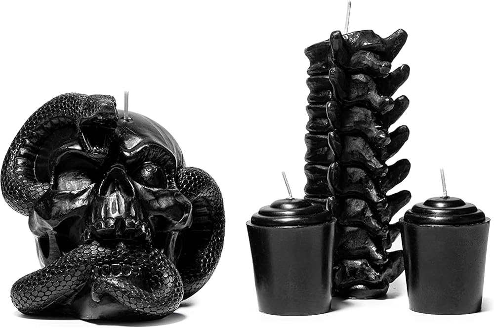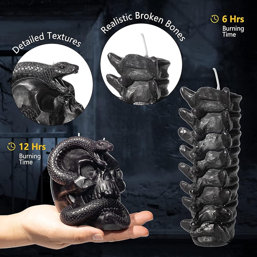 شمعة ممتعة وفريدة من نوعها لتجعل تحضيرات الحفلات ذات الطابع المخيف أكثر رعبًا وأجواءً. الجماجم والعمود الفقري بالشمع الأسود اللون. هل ترى؟ إنهم يتنفسون. إنهم على قيد الحياة! إذا كنت من محبي الديكور المرعب، فإن مجموعة الشموع هذه هي المناسبة لك.