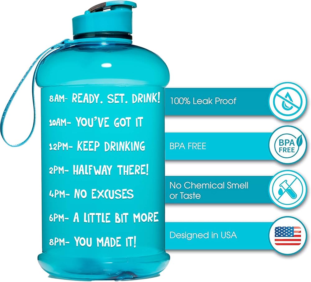 زجاجة مياه سعة 1/2 جالون مع تحديد أوقات الشرب - الآن أسهل من أي وقت مضى شرب أفضل كمية من الماء طوال اليوم بغطاء عالي الجودة وتذكير للشرب وزجاجة مياه متتبع بمقبض لتعزيز استهلاكك اليومي من الماء.