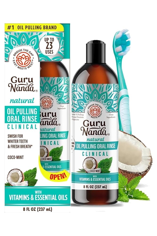 No artificial flavors. No. 1 pulling oil brand. daily ayurvedic regimen, swish for oral health, Simple. Natural. Proven. Pure & natural oral care. Ayurvedic whitening formula. No synthetic ingredients. Ayuvedic formula: ayurveda is a 5,000+ year old holistic health science. Oil pulling is part of an ayurvedic lifestyle that focuses on maintaining health and bringing balance to your body. Naturally helps 'pull' bad bacteria from your mouth. Formulated by an ayurvedic expert: . Alcohol-free. Fluoride-free. Never tested on animals. Traditional Benefits of Oils: Fresh Breath: Spearmint; peppermint; cardamom; fennel. Support Gum Health: Clove; oregano; tea tree. Ayurvedic Dosha Cleansing: Coconut oil. May Support Oral+Bone Health: Vitamin D, E, and K2. www.GuruNanda.com. Be the Guru of your Wellness. Questions 866-421-0309; www.GuruNanda.com; namaste(at)gurunanda.com. Never tested on animals. Cruelty free. FSC: Mix - Packaging. www.fsc.org. (The statements on this package have not been evaluated by the Food and Drug Administration. This product is not intended to diagnose, treat, cure or prevent any disease.) Packaged in U.S.A.