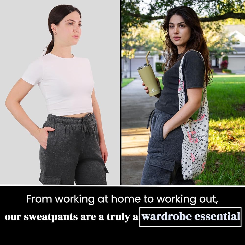 2 Pack womens cargo jogger pants. Athleisure fleece cargo joggers sweatpants are breathable, lightweight stretchy super soft and comfy sweats with adjustable elastic rope in the ankle cuffs to keep your legs in good shape and adjust pants length and style. Perfect for all-day casual lounging, home wear and outdoor running, walking, hiking, gym, workout, weightlifting activities
