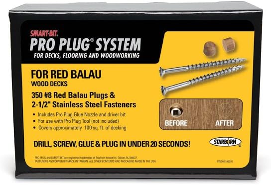 The Smart-Bit PRO PLUG System makes plugging Red Balau decks fast & easy. Engineered to create a perfect looking & fitting result. Part of a system, the PRO PLUG Plug & Fastener Kit for IPE contains uniquely designed IPE plugs, stainless steel screws, star drive bits and the revolutionary glue nozzle. PRO PLUG IPE plugs have a unique design which combines the best of flared and straightwall designed plugs. The unique chamfer design with reduced flare angle offers easy insertion and an extremely tight fit. As the plug compresses around the top of the hole, it allows for complete insertion of the plug without sawing or chiseling. The revolutionary new PRO PLUG glue nozzle is designed to deposit glue on the sides of the countersink hole where the glue is needed for holding power. Little or no glue is deposited on the bottom of the hole where excess glue can create a hydraulic lock, preventing plug insertion. PRO PLUG glue nozzle works with most waterproof wood glues such as Elmer's Waterproof Wood Glue or Titebond. The PRO PLUG Tool is used to prepare the decking for the IPE plugs. It creates a screw hole and countersink portion that perfectly matches PRO PLUG plugs. The Smart-Bit PRO PLUG Tool for Wood contains one Smart-Bit Tool, 2 replacement bits, 1 stub bit and an allen wrench. Additional replacement bits may be purchased separately. All you need to get started is a PRO PLUG Tool for Wood and a PRO PLUG Plug & Fastener Kit for IPE along with a bottle of waterproof wood glue and a few simple tools. Used together, the PRO PLUG Tool and PRO PLUG Plug & Fastener System results in a beautiful, high end Red Balau plugged deck in half the time. Warning: This product can expose you to chemicals which is [are] known to the State of California to cause cancer and birth defects or other reproductive harm.