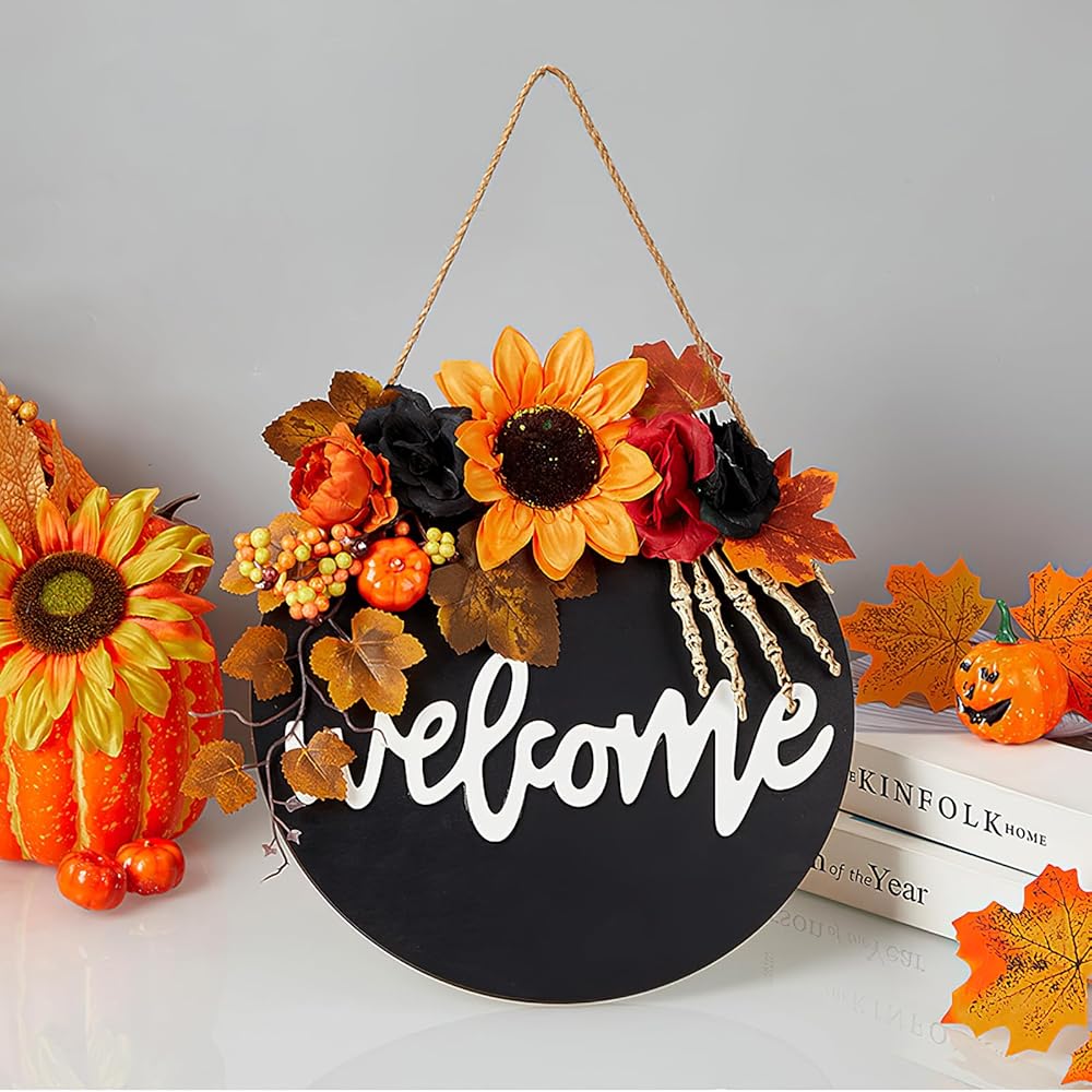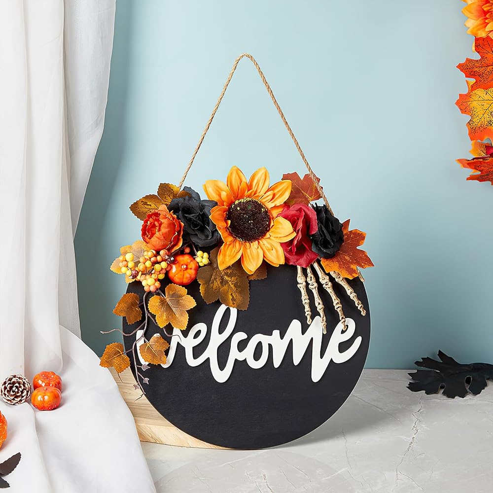 سقوط علامة ترحيب للباب الأمامي - 12 بوصة الخريف خشبية معلقة علامة سقوط أكاليل الباب مع أوراق القيقب الاصطناعية اليقطين لشرفة المزرعة عيد الهالوين عيد الشكر حصاد ديكور جدار المنزل