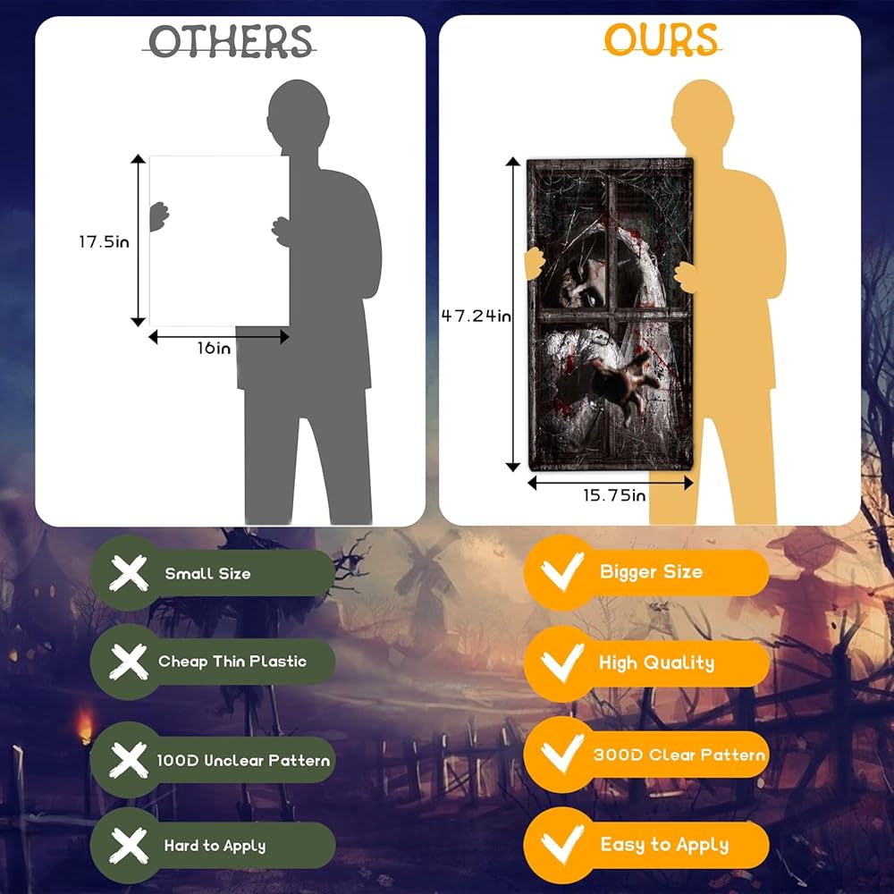 • 【سوف تحصل على قطعتين من ملصقات نوافذ الهالوين مقاس 47.24 سم × 15.75 سم، أنثى واحدة وذكر. ضعها على نوافذك لخلق مشهد مخيف للهالوين. امنح ضيوفك تجربة لا تنسى ومخيفة للعمود الفقري، مما يجعل منزلك الأكثر مسكونًا في المبنى!