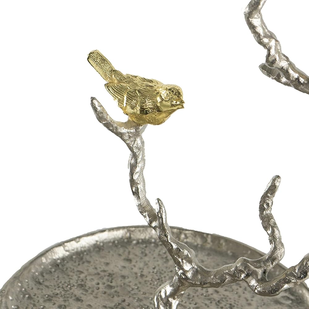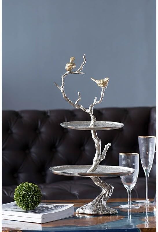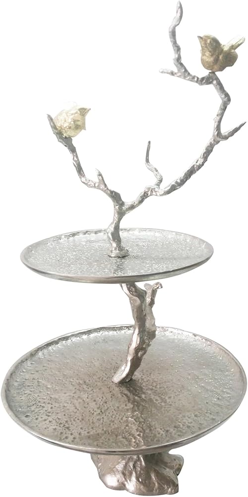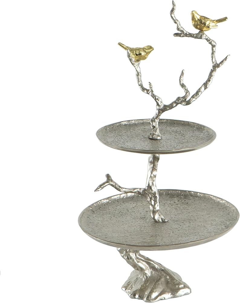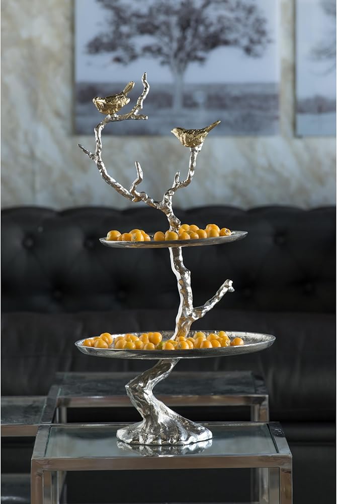 Bring a finishing touch to any area with the fresh and elegant design of the 2-tiered aluminum serving tray. The tree branch with birds design and beautiful silver gold finish provide noticeable style in this versatile home accent. It is fine display piece for fruits, flowers, candy, soap, potpourri, kitchen necessities - the possibilities are endless! sturdy, yet delicately elegant. Made of Aluminium. Measures: 12.99 inch L x 9.84 inch W x 23.62 inch H