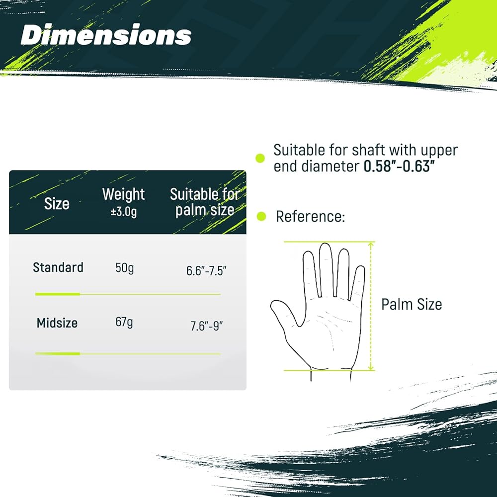 المجموعة الأساسية: 13 قبضة. الحجم المتوسط: 67 جم +/- 3 جم. مناسب للعمود بقطر الطرف العلوي 0.58 بوصة - 0.63 بوصة