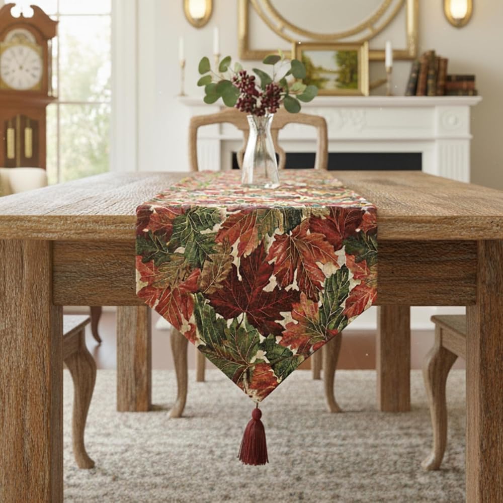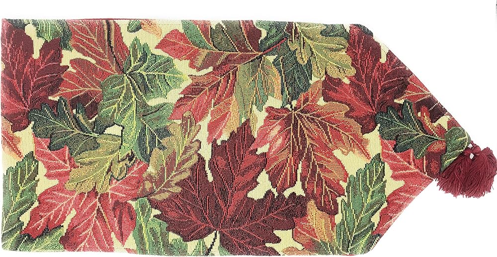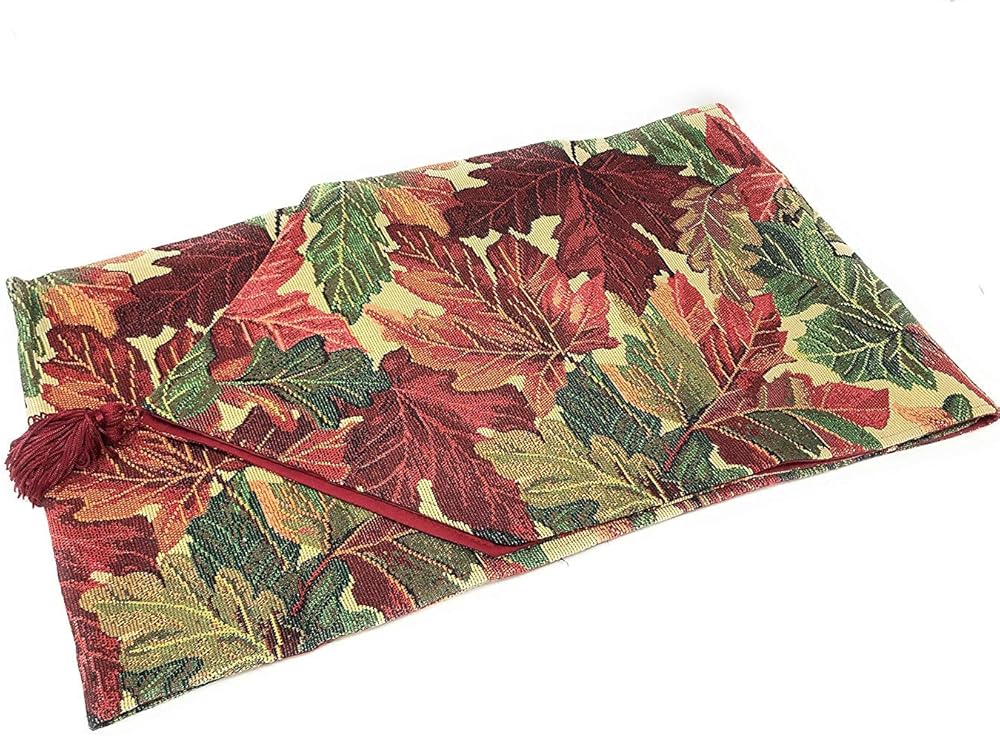 أوراق الخريف المتناثرة في جميع أنحاء التصميم - يتميز مفرش الطاولة المنسوج بأطراف مدببة مع شرابات - ألوان دافئة، أحمر متعدد الألوان، بورجوندي، برتقالي، أصفر، أخضر، بني، وبيج - هدية مثالية لعطلة عيد الشكر وموسم الخريف والشتاء