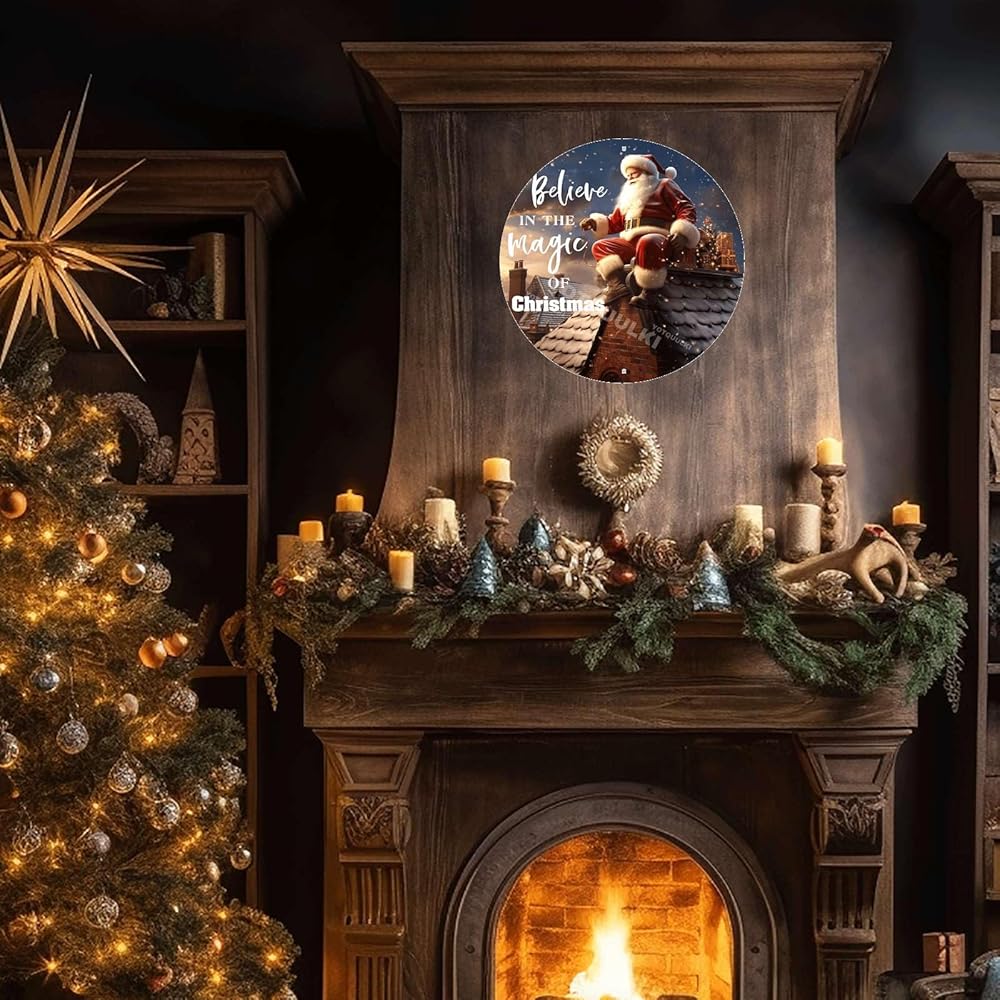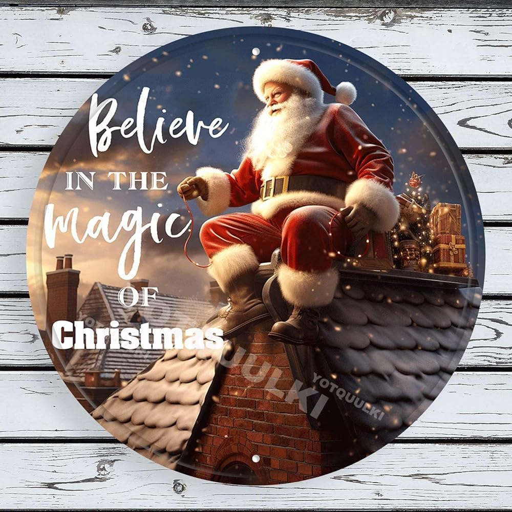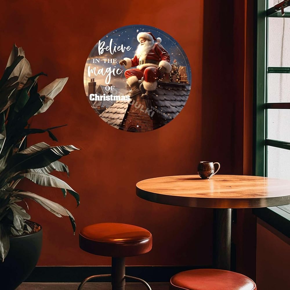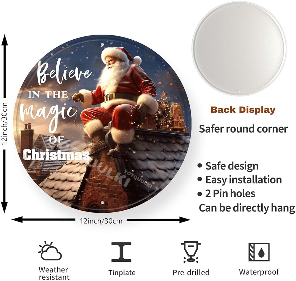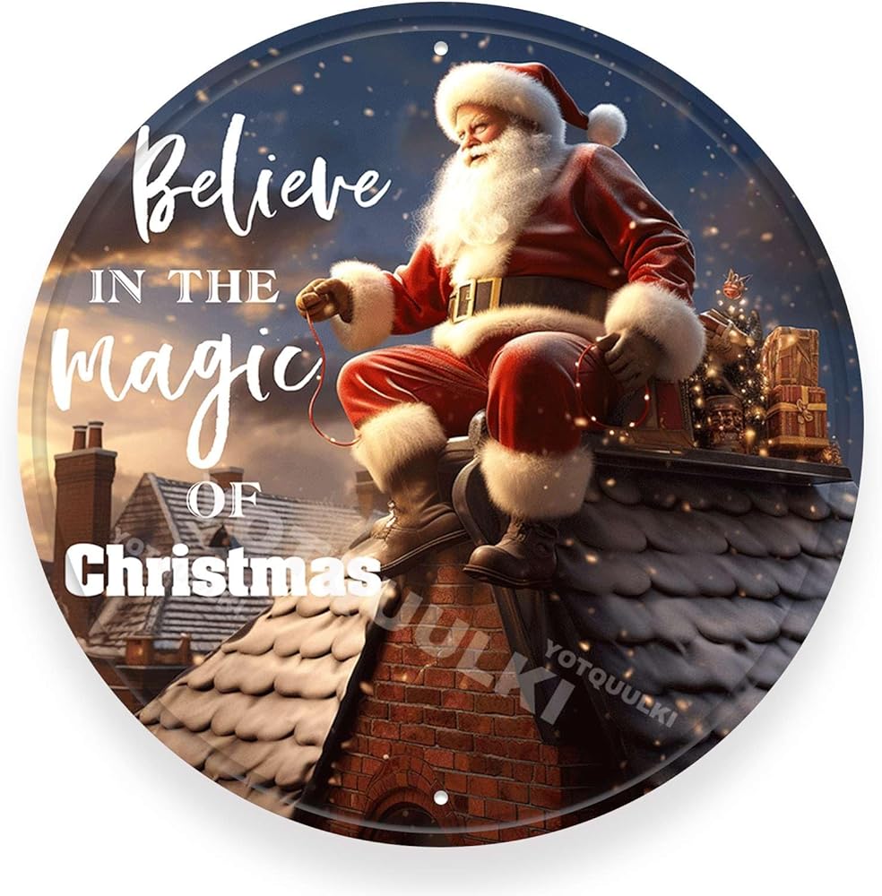 Round Metal Tin Sign Rustic Wall Decor Santa Believe in The Magic of Christmas Wreath Sign Suitable for Home Garden Kitchen Bar Cafe Restaurant Garage Wall Decor 12.00"x12.00"