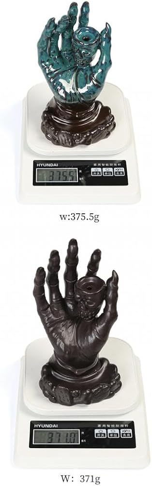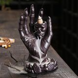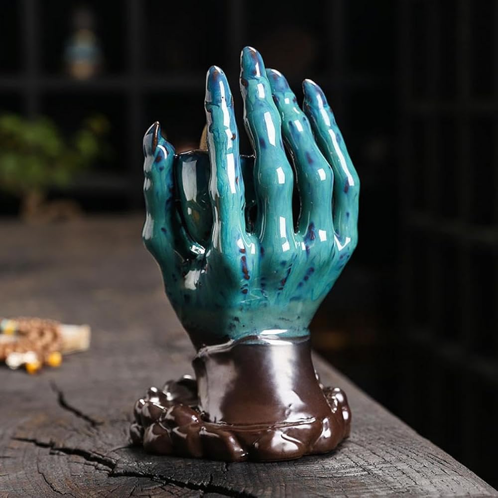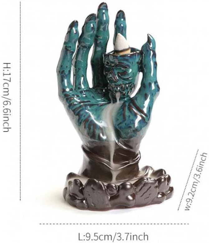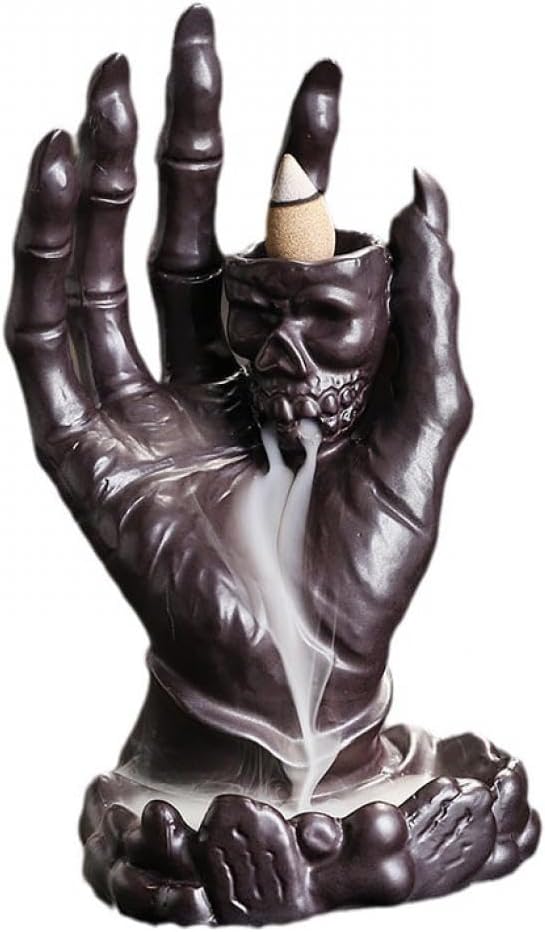 • UNIQUE DESIGN:This is a skull with hand shaped incense holder when you light the incense cone on the top of the moon, the smoke will down from the top to the bottom which can form a visual effect of flowing water like a waterfall of smoke.