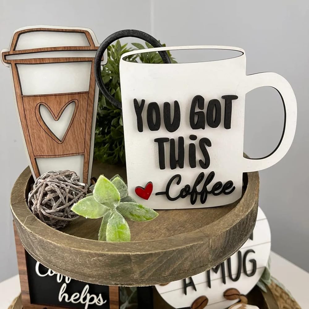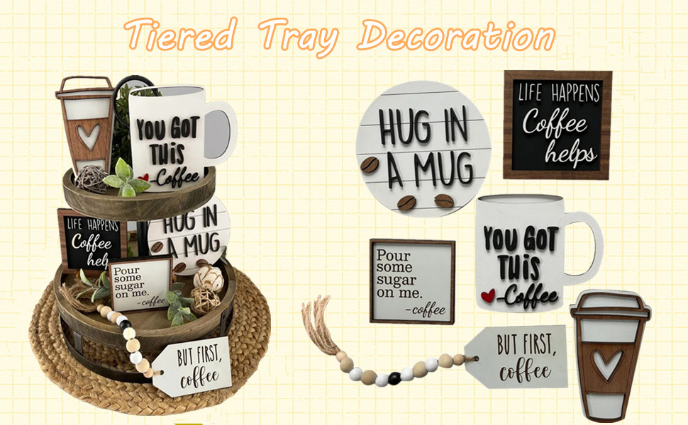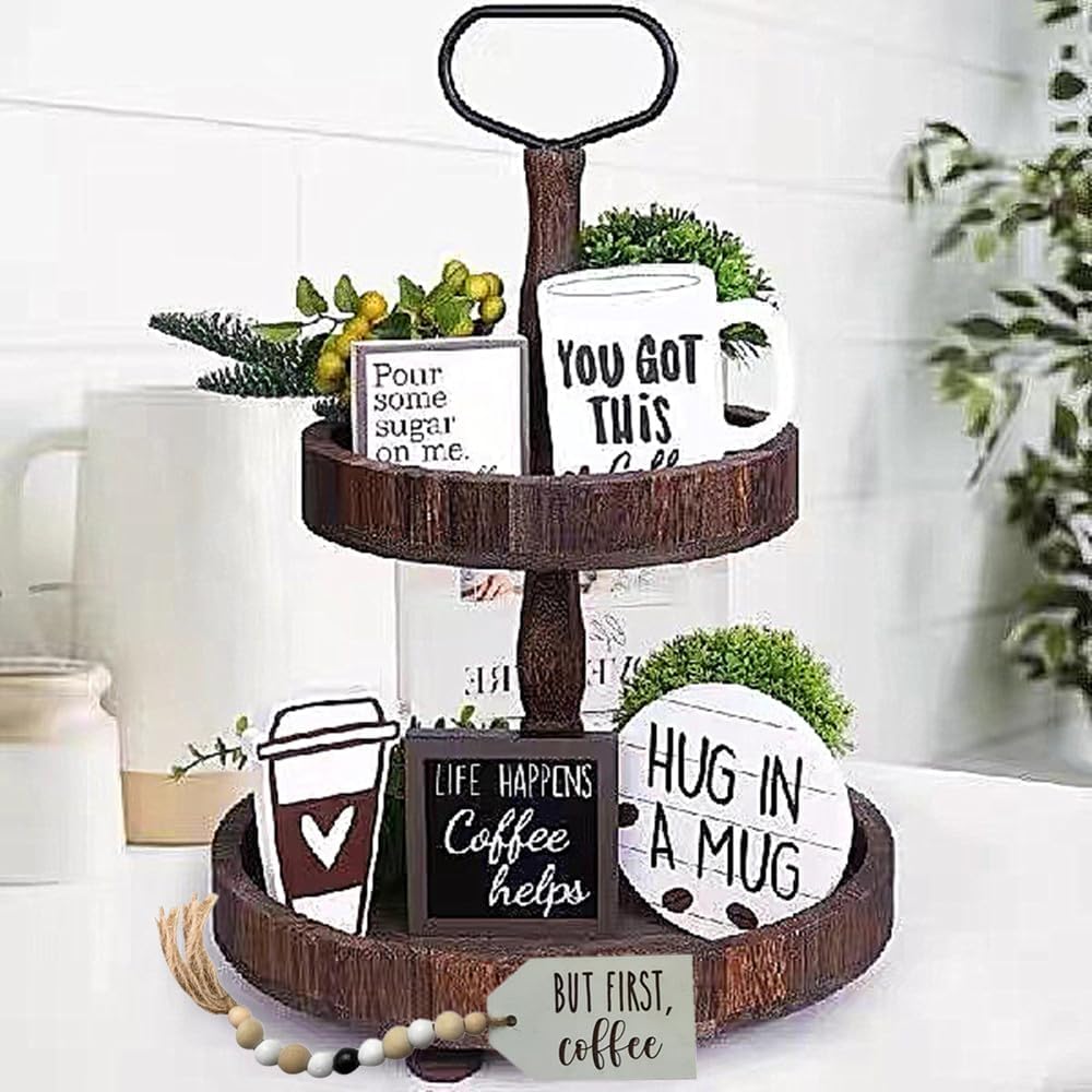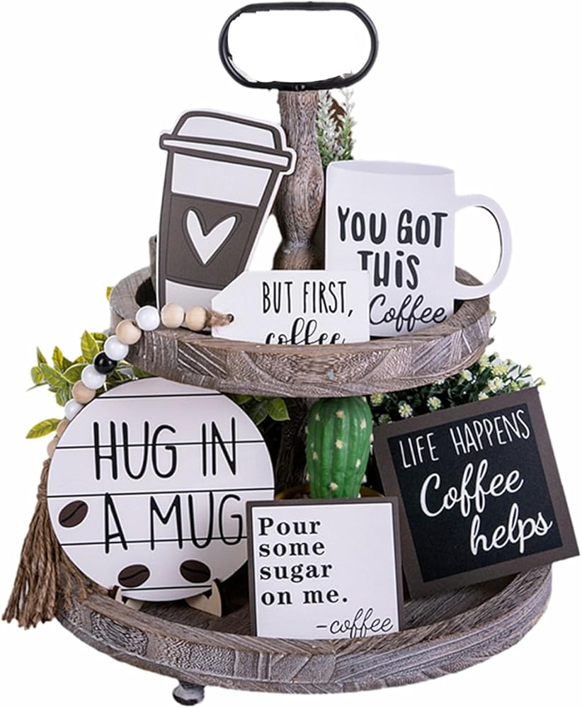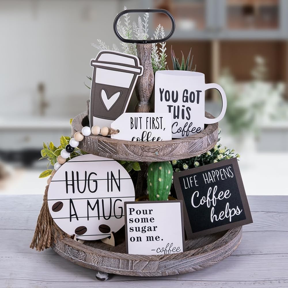 موضوع القهوة: يتضمن لافتات خشبية، وصواني معدنية، ونباتات صغيرة يمكنك عرضها على الرفوف، أو الخزانات، أو طاولات الطعام، أو المواقد. يمكنك أيضًا استخدامه لإبهار ضيوفك وجيرانك بذوقك وأسلوبك. مجموعة ديكور صينية القهوة ذات الطبقات هي هدية مثالية لأي محب للقهوة أو لأي شخص.