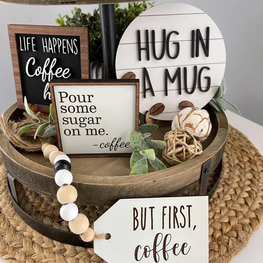 ديكور بنمط رائع: تتميز مجموعة ديكور صينية القهوة الخاصة بنا بنمط رائع سيجعل ديكور سطح الطاولة الصيفي الخاص بك أكثر متعة وجاذبية. يتضمن لافتات خشبية وصواني وزخارف أخرى تخلق جوًا مريحًا.