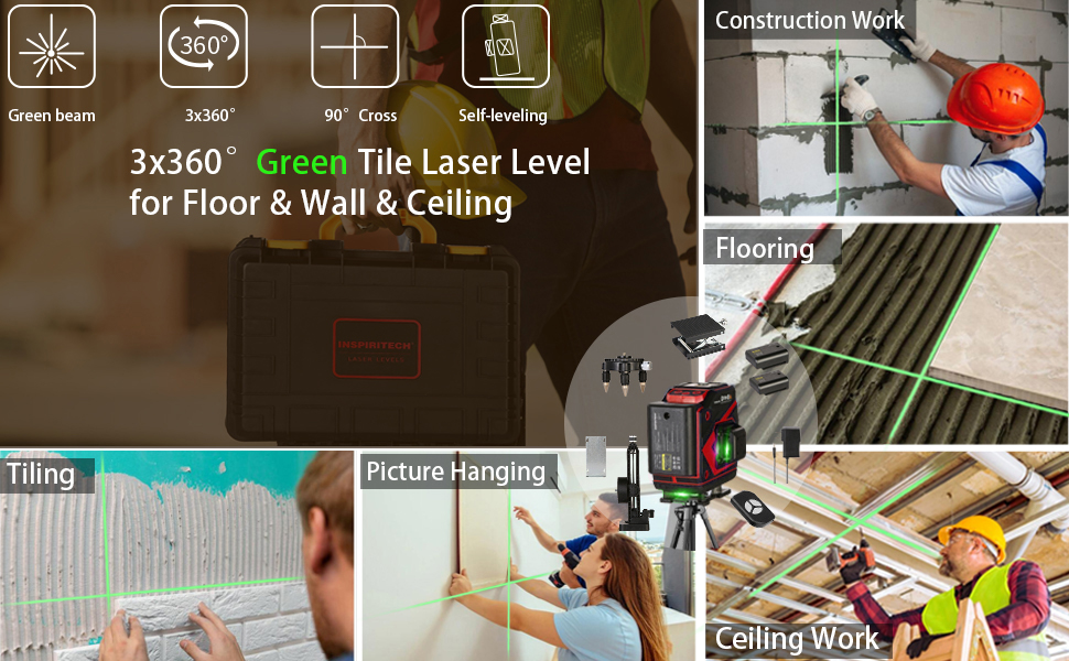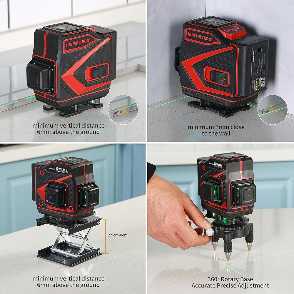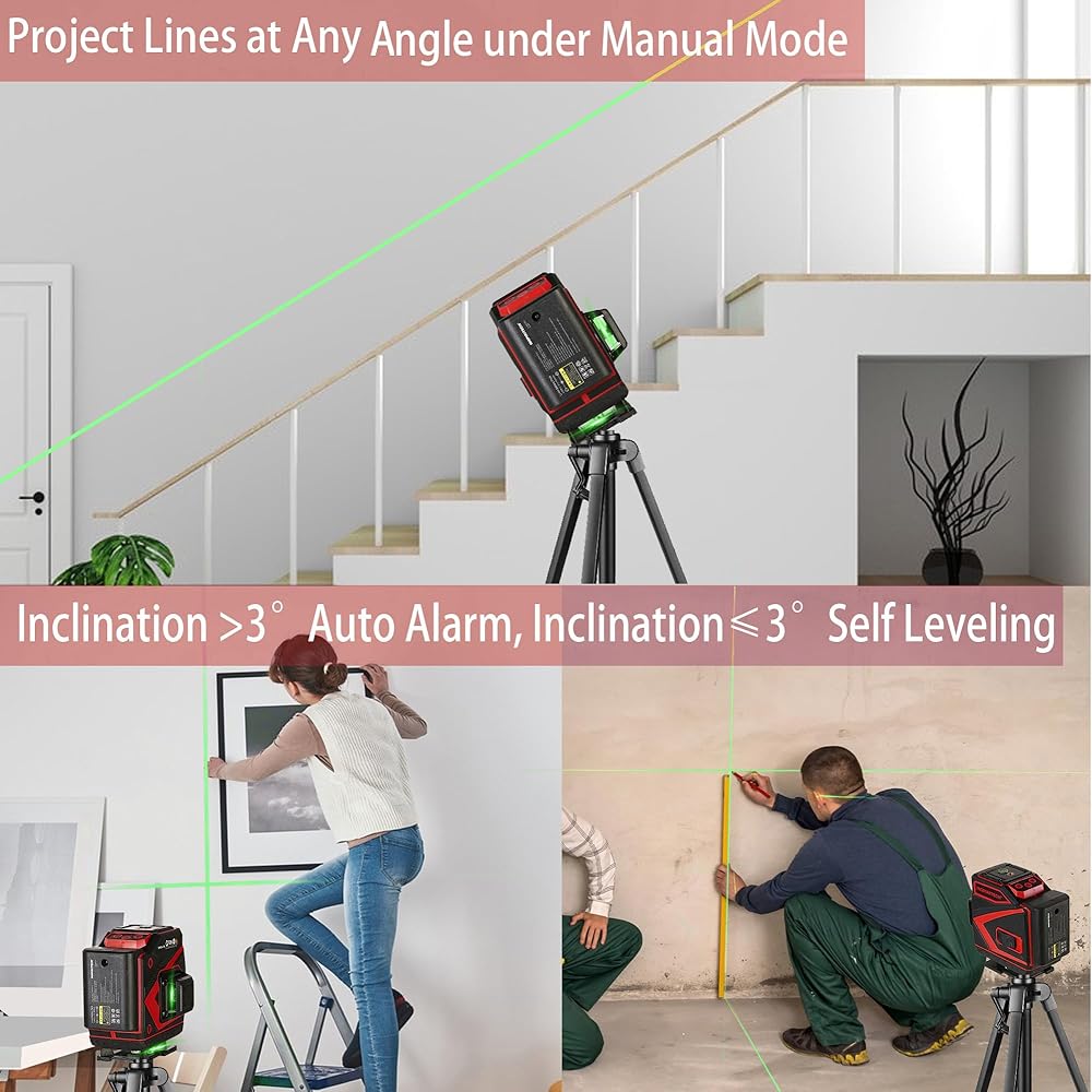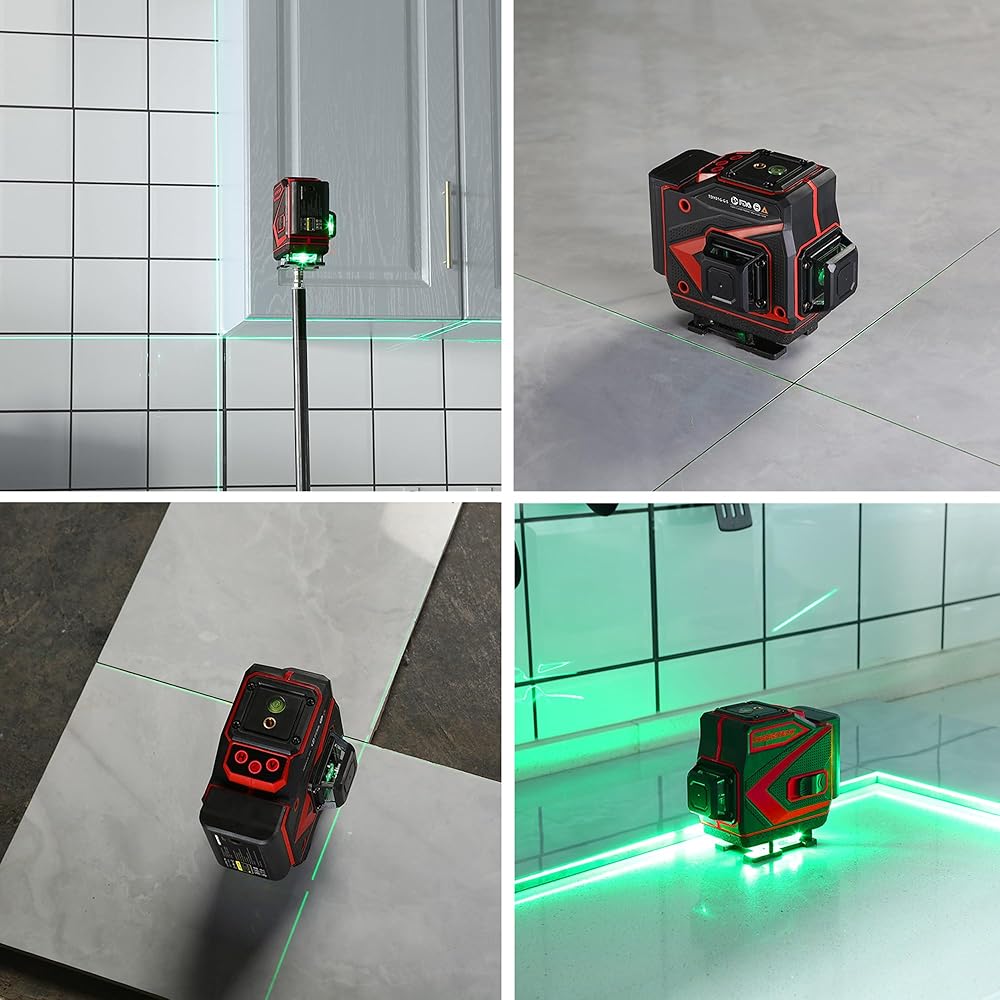 【رؤية عالية لبلاط الأرضيات والجدران/الأسقف المعلقة】 - الليزر الأفقي السفلي (الحد الأدنى للمسافة 6 مم) مناسب للأرضيات. الليزر العمودي على كلا الجانبين (مسافة لا تقل عن 7 مم) يسهل عمل تبليط جدارين في نفس الوقت. مستويات 3x360 درجة، وتقاطع عمودي 90 درجة، و12 ليزر أخضر يغطي الغرفة بأكملها والجدران والأرضيات والأسقف، مما يجعل عملك أسهل بكثير.