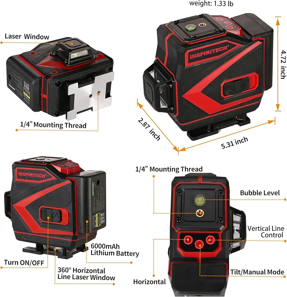 【ما تحصل عليه】 - 1 × مستوى ليزر INSPIRITECH ثلاثي الأبعاد 360، 2 × بطاريات ليثيوم 6000 مللي أمبير في الساعة، 1 × جهاز تحكم عن بعد، 1 × لوحة معدنية مشقوقة للأظافر، 1 × دعامة حائط مغناطيسية، 1 × قاعدة دوارة دقيقة، 1 × قاعدة ضبط دقيقة لرفع المقص، 1 × شاحن سريع، محول خيط 1x 5/8 بوصة إلى 1/4 بوصة، 1 × دليل المستخدم باللغة الإنجليزية، 1 × حقيبة حمل صلبة فاخرة مع فتحات إسفنجية للحماية بالداخل.