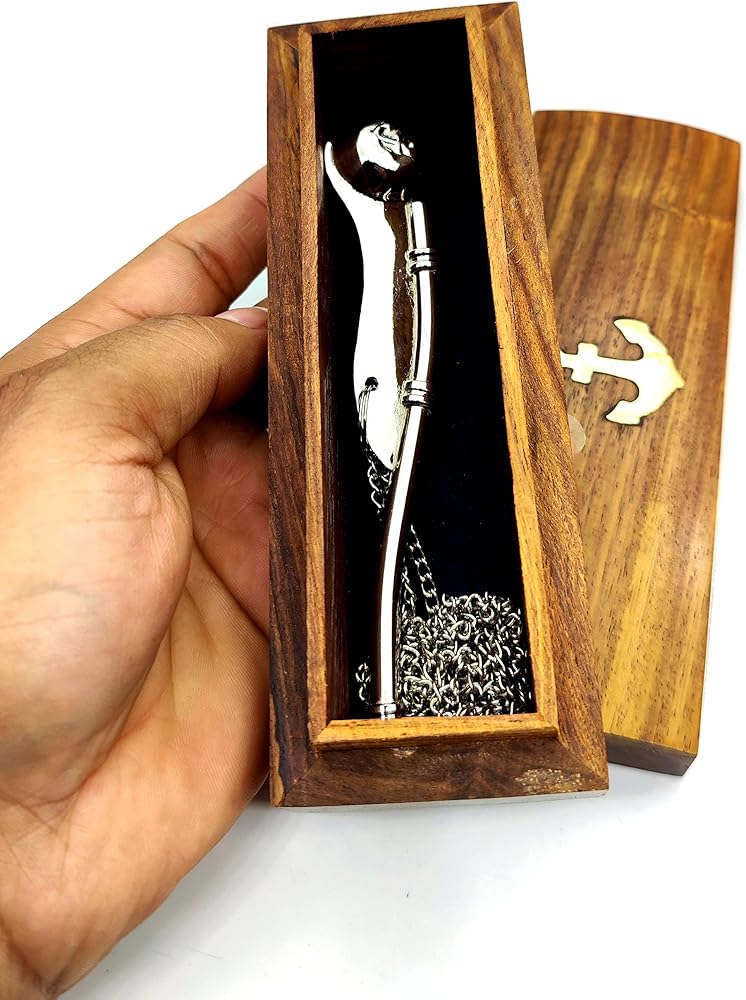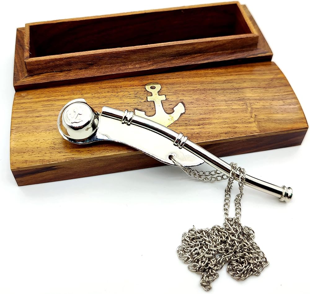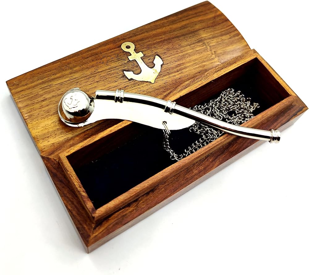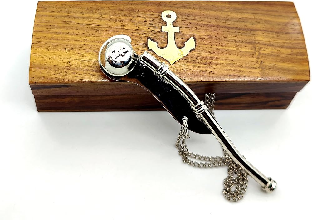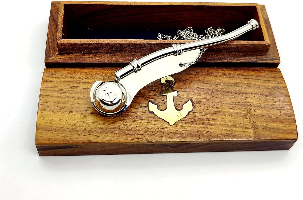 The Nautical Boatswain's Pipe (bosun's Pipe) is one of the oldest and most distinctive pieces of nautical equipment. The boatswain's pipe, whistle, or flute, was used in Greece and Rome to keep the stroke of galley slaves. This beautifully detailed solid brass and copper Navy Boatswain's Pipe comes with a quality 35 inch solid brass chain lanyard. The pipe has a traditional anchor design inlaid in copper on both sides. The boatswain's pipe measures 5 inches (12.7 cm) long, and the pipe and chain weigh 1.6 ounces (45 grams), and yes, it really whistles.The boatswain's pipe comes with a beautiful solid hardwood felt lined storage and display case. Solid brass and copper no plastic parts 35” chain lanyard brass links keep whistle secure Traditional design of a bosun's pipe Fully functional actually works