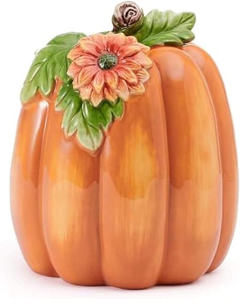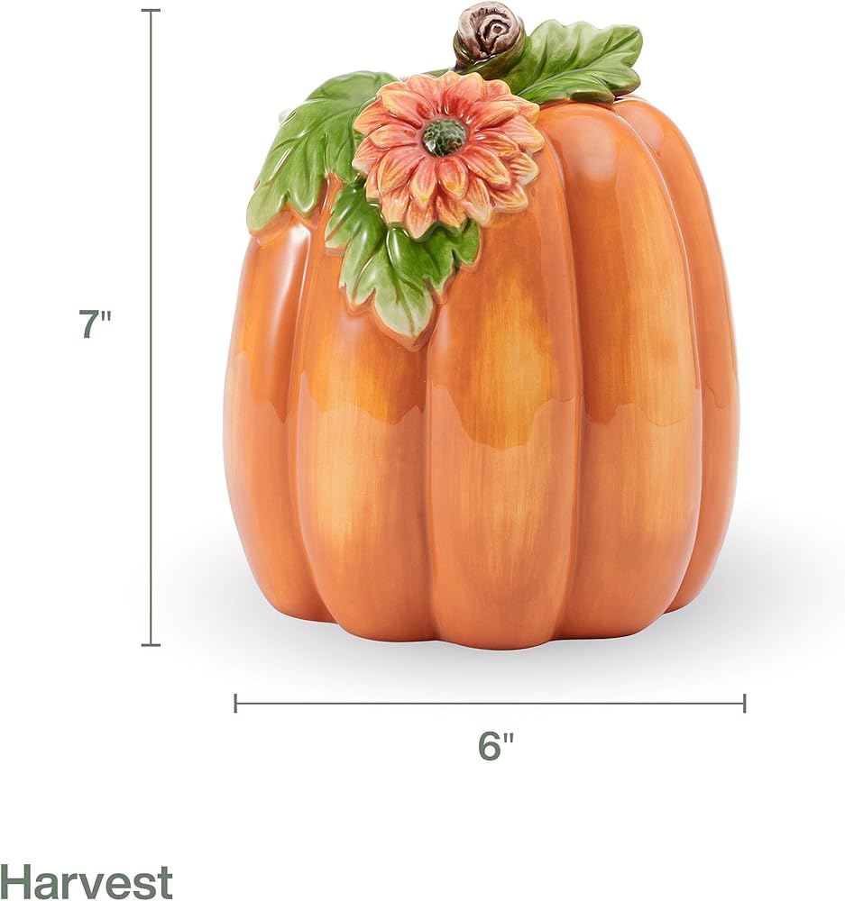 Bring the essence of fall into your home with the Fitz and Floyd Autumn Harvest Acorn Orange Pumpkin Figurine. This elegant piece adds a warm, festive touch to any room. Perfect for display on your mantel, dining table, kitchen table, bathrrom vanity or as part of a seasonal centerpiece, this pumpkin figurine captures the vibrant colors and cozy charm of autumn. Handcrafted from ceramic earthenware by Fitz and Floyd artisans, it measures 7-1/2 inches tall and 8-1/2 inches in diameter. Welcome fall into your home with this timeless piece—simply wipe with a damp cloth to keep it looking its best.