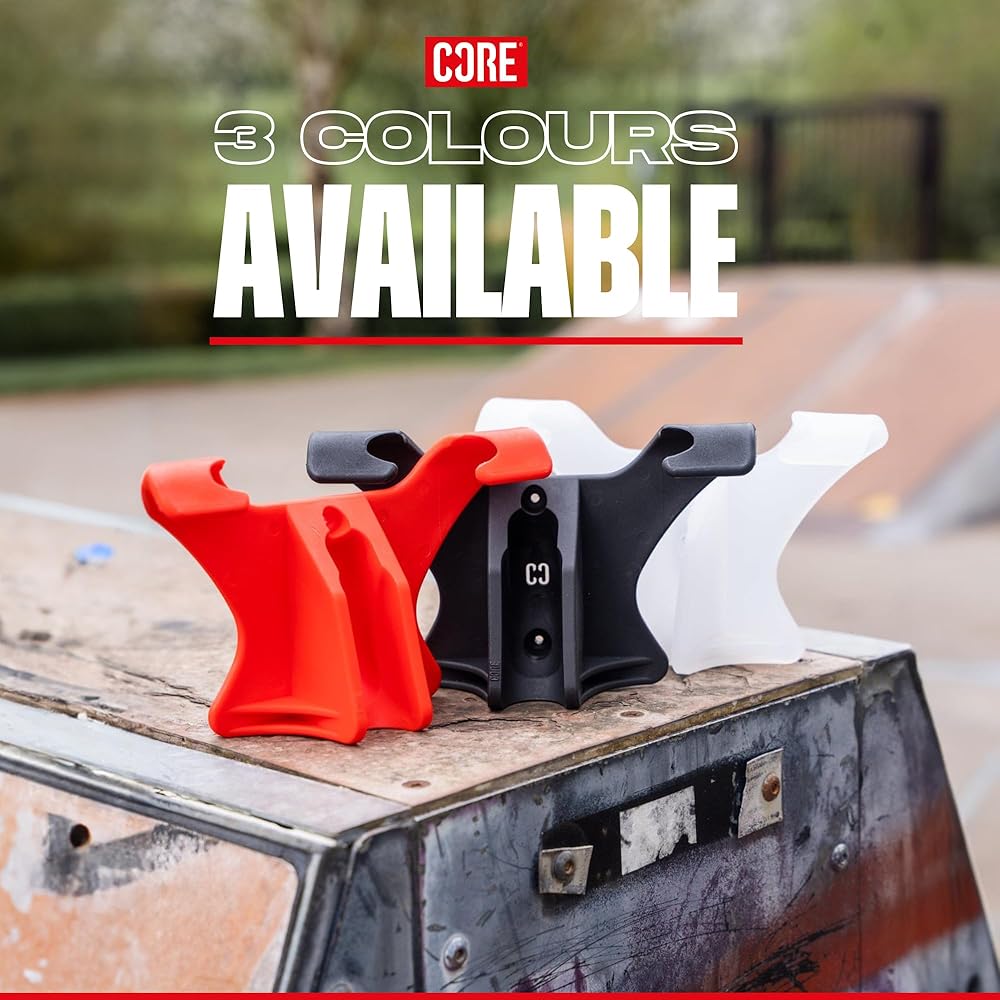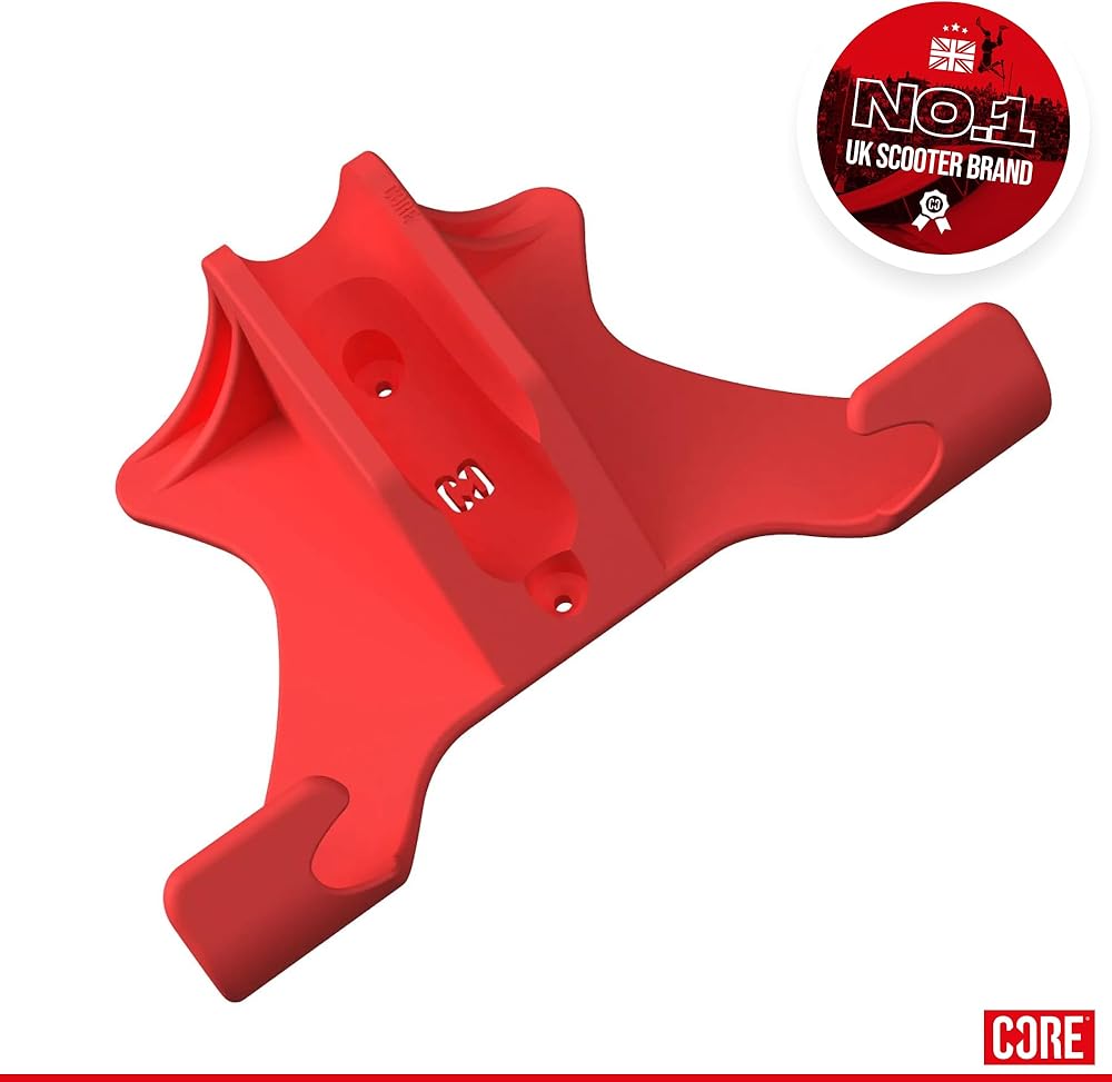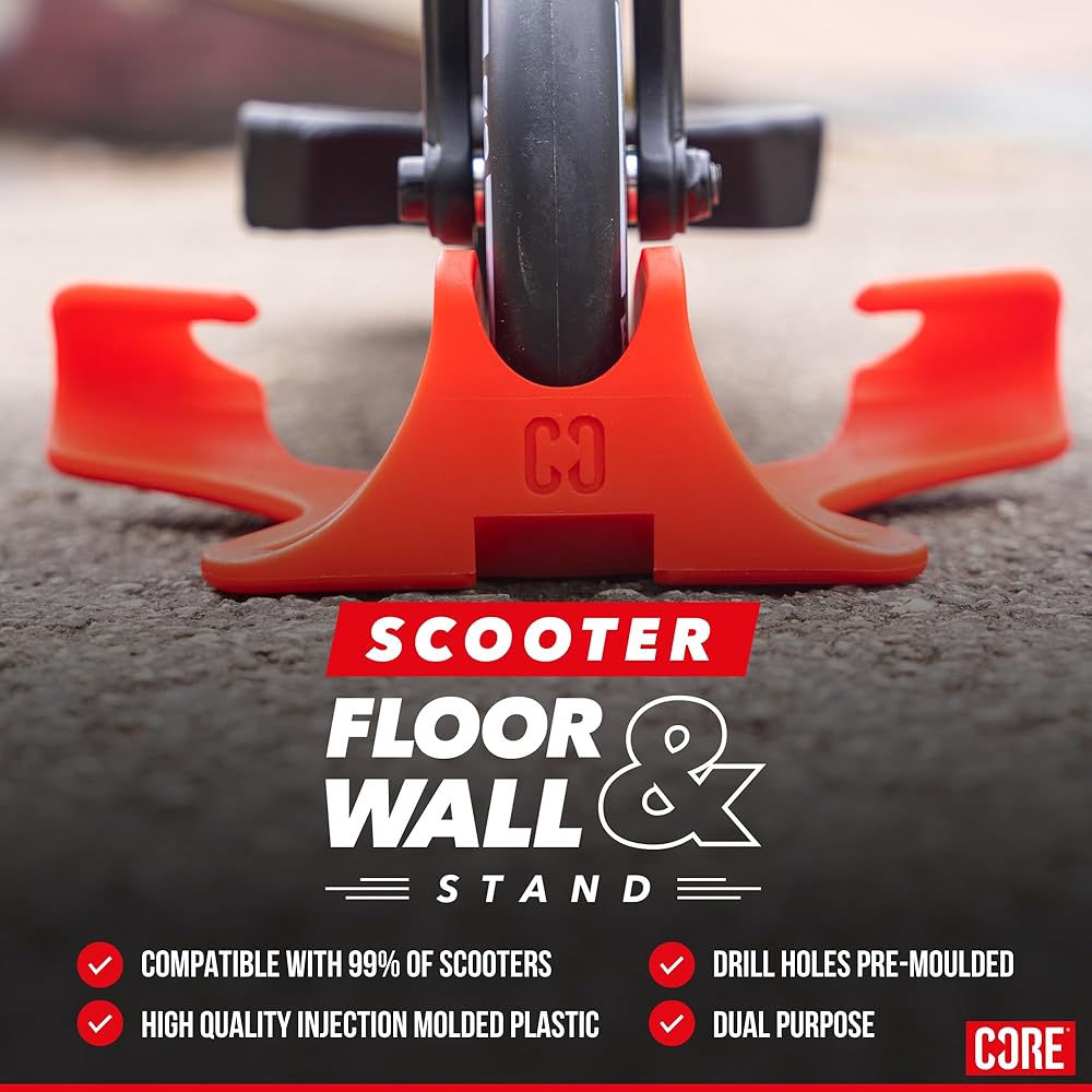 "CORE SCOOTER WALL & FLOOR STAND FEATURES Compatible with 99% of scooters Fits 24mm wheels (standard size) Fits 30mm wheels (big wheels) Hangs on the wall using handlebars Dual purpose High quality injection molded plastic Logos embossed into the stand Drill holes pre-molded EASY STORAGE SOLUTION Is your scooter always getting in the way around your house? If you're anything like us, you're constantly tripping over scooters on the floor so we decided to do something about it. DUAL PURPOSE SCOOTER STAND Introducing the CORE Scooter Wall & Floor Stand, like the name suggests this is a dual-purpose stand with the ability to get your scooter off the floor and onto your wall out the way. Hang it up in your garage, shed, or even your bedroom. If you don't want to put it on your wall you can use it as a traditional floor stand that will fit both 24mm and 30mm wheels. *WHEN DRILLING SCOOTER STAND TO PLASTERBOARD OR MASONRY MAKE SURE YOU USE WALL PLUGS. NOT PROVIDED."