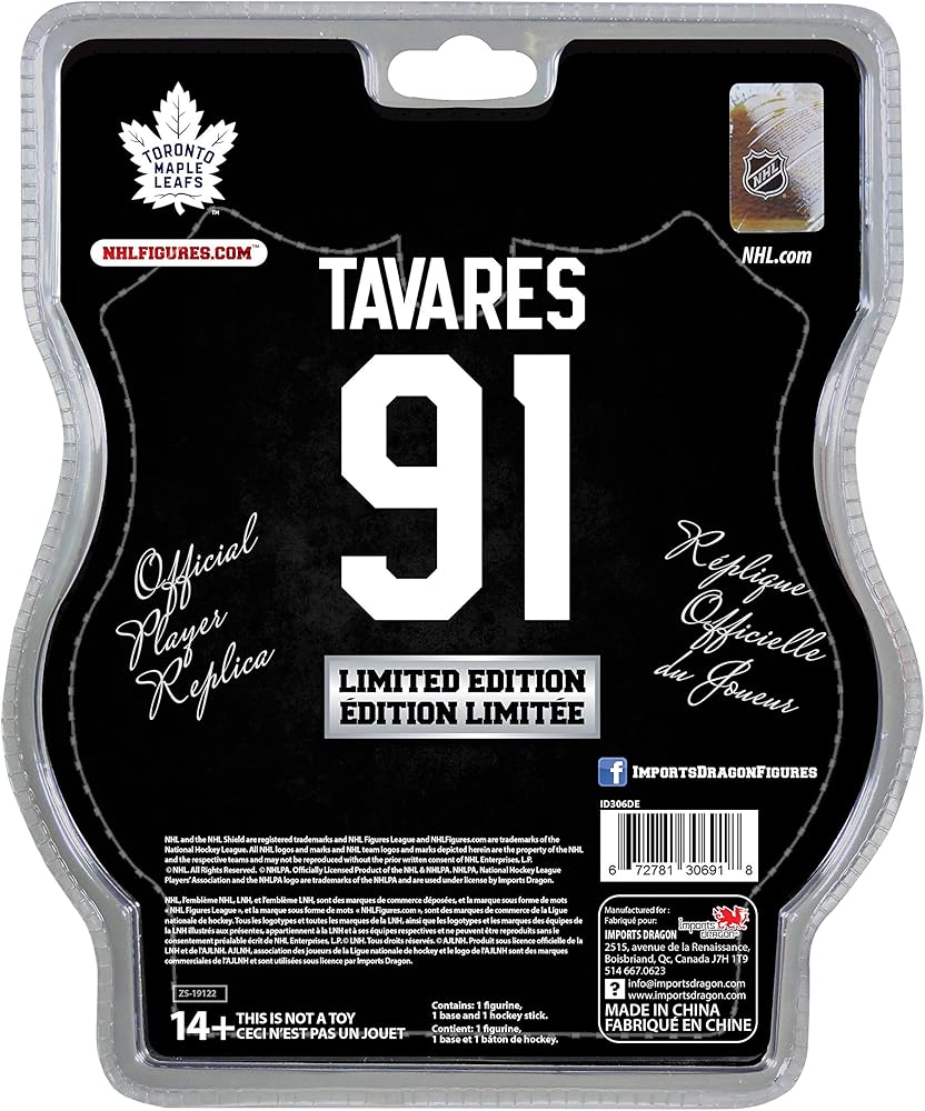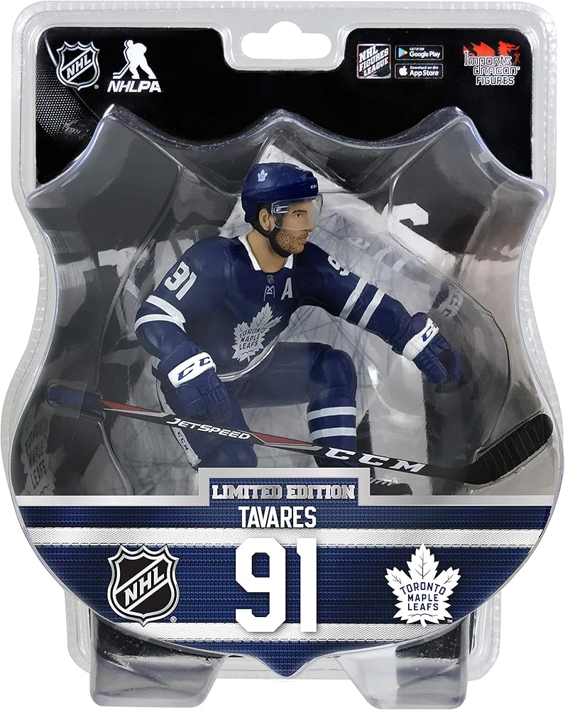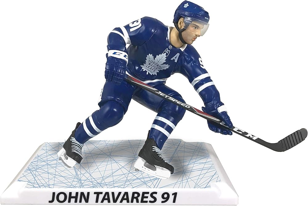 This highly detailed 6'' Figure features John Tavares center and assistant Captain of the Toronto maple Leafs in his blue home jersey. The package includes one 6-inch figure, one plate and one hockey stick. The plate has a detailed ice surface, The player name and number are featured at the front of the stand with the limited edition and numbering on the back. Limited edition figure only 3600 made. We took some of the best players of the National hockey League, studied them and brought them to life to offer you officially licensed real-looking collectible figures. Their action-inspired poses and official replica equipment are a proof of the time and attention We have put into making each player