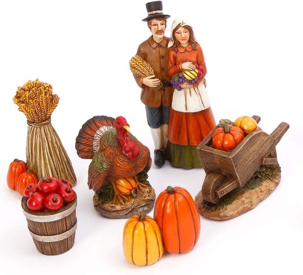 The set includes a man and woman pilgrim couple, a turkey, a wheelbarrow of pumpkins, a bushel of wheat, two large pumpkins, and a barrel of apples.