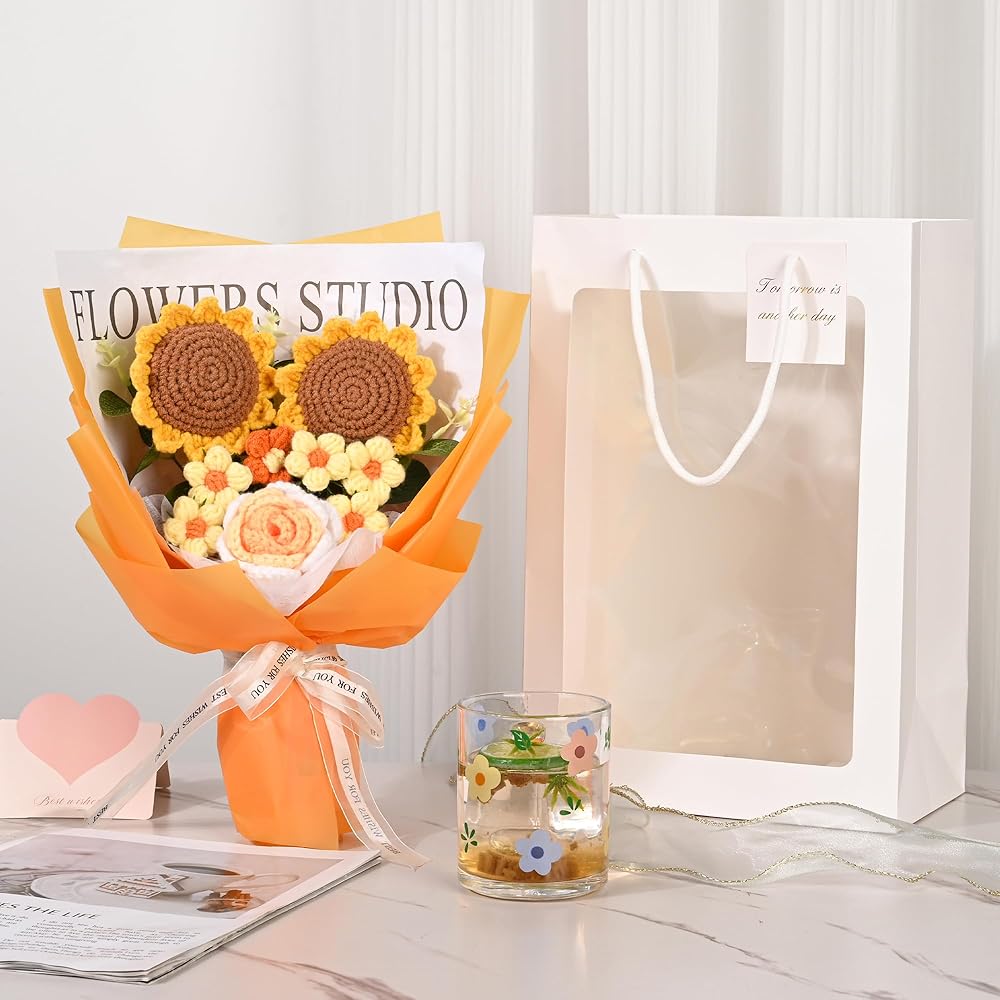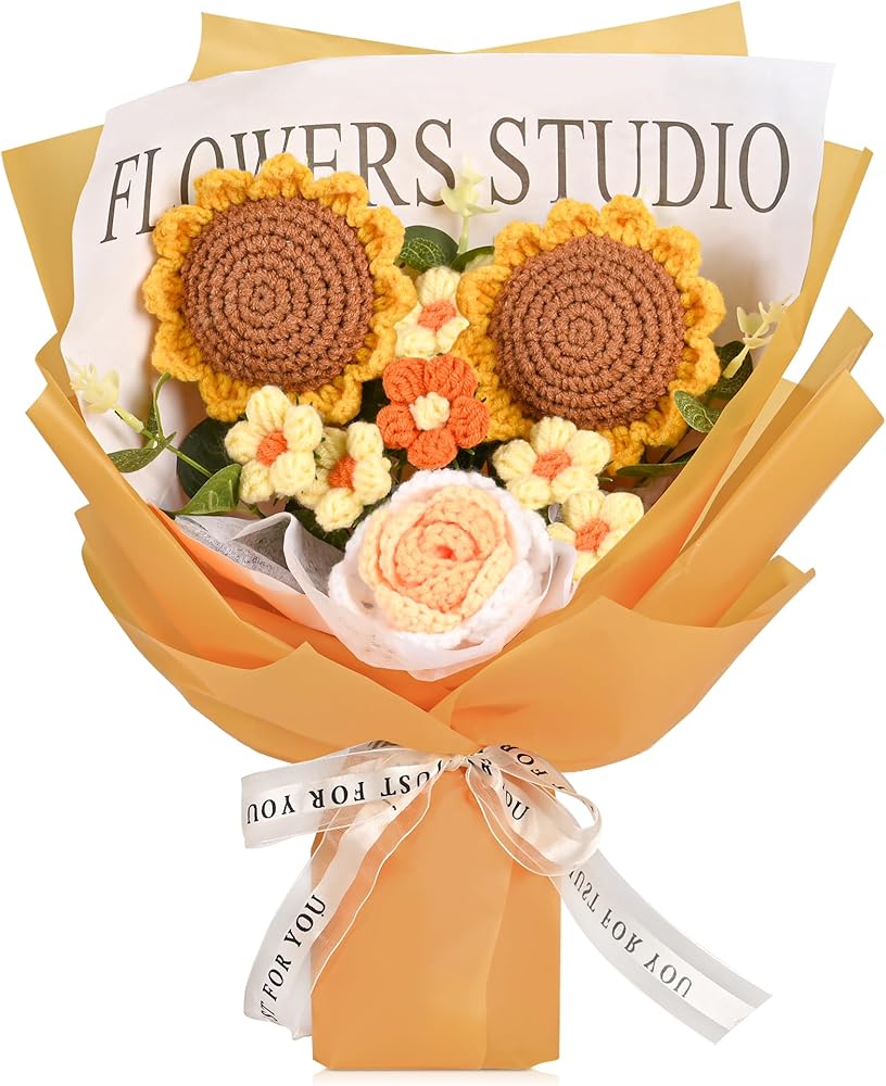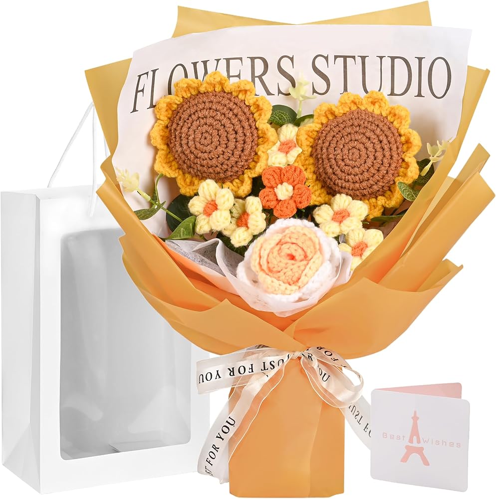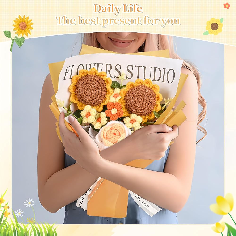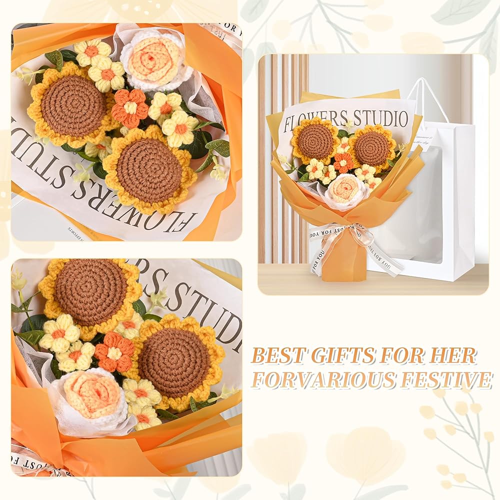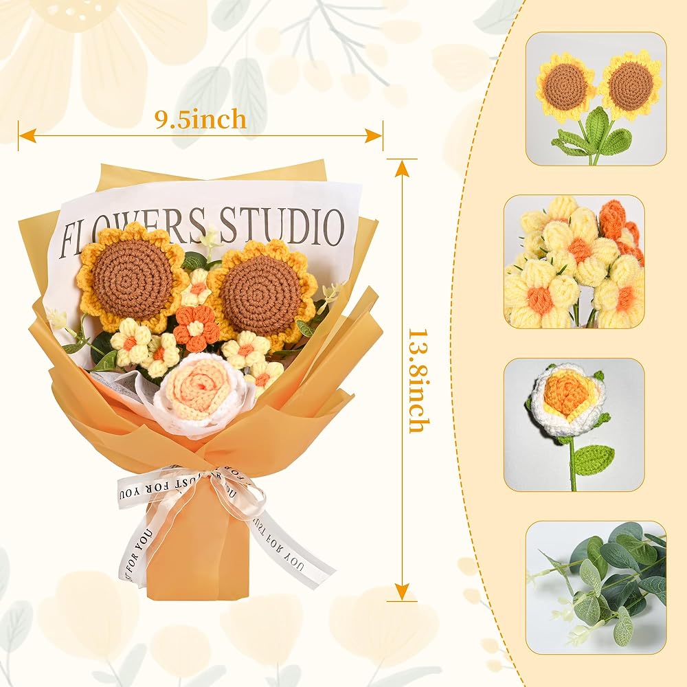 • قائمة التعبئة: سوف تحصل على قطعتين من عباد الشمس المنسوج يدويًا، قطعة واحدة من الورد المنسوج يدويًا، قطعة واحدة من التوليب المنسوج يدويًا، قطعتين من الإقحوانات المنسوجة يدويًا و7 أوراق مصنوعة يدويًا. تأتي باقة الزهور المحبوكة مع حقيبة هدايا وورق خلفية بشريط